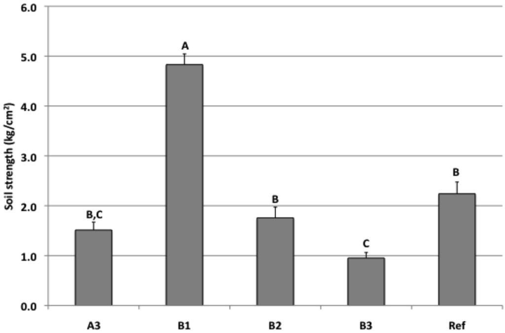 Surface soil strength using a hand held penetrometer. Different letters indicate a significant difference α = 0.05. Error bars represent standard error of the mean.