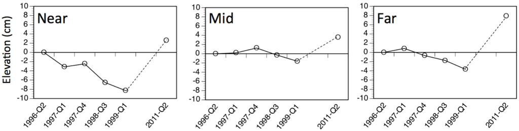 Wetland surface elevation south of the Violet Siphon increased at all sites compared to the historical measurements taken in 1996–1999 [21]. The Near site had an elevation 8.3 cm lower in 1999 than initial measurements made in 1996, however, measurements made in 2011 indicate elevation has risen 10.9 cm since 1999 (Figure 6). The Mid site elevation decreased 1.62 cm during the 1996–1999 period, but has since increased 5.2 cm and is now 3.6 cm above initial measurements made in 1996. Elevation at the Far site decreased 3.7 cm from 1996 to 1999, but then increased 11.6 cm from 1999 to 2011 to be 7.9 cm above initial measurements. Accretion measured during spring 2011, which encompasses all accretion since 1996, was 10.4 ± 0.31 cm at the Near site, 6.4 ± 0.37 cm at the Mid site, and 4.12 ± 0.34 cm at the Far site.