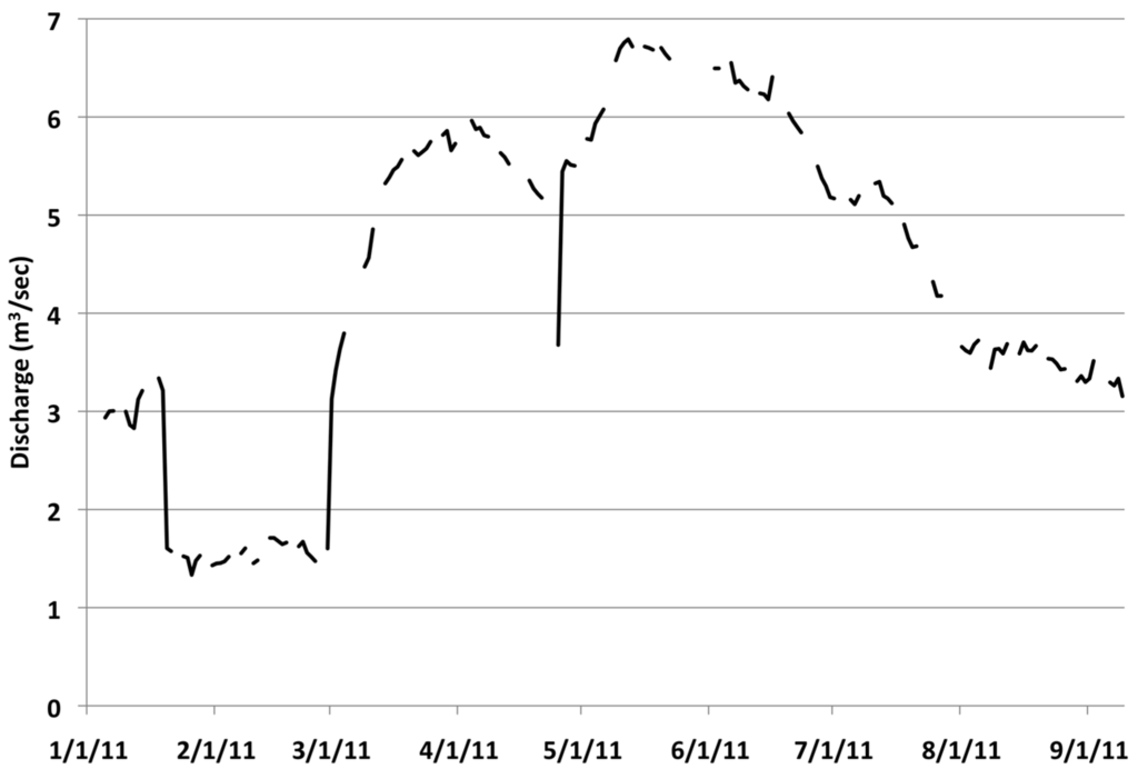 During this study, discharge from the Violet Siphon ranged from about 1.5 to 7.0 m3/s (Figure 8), with peak discharge in May and June 2011, and no flow from September 10th through the end of 2011.