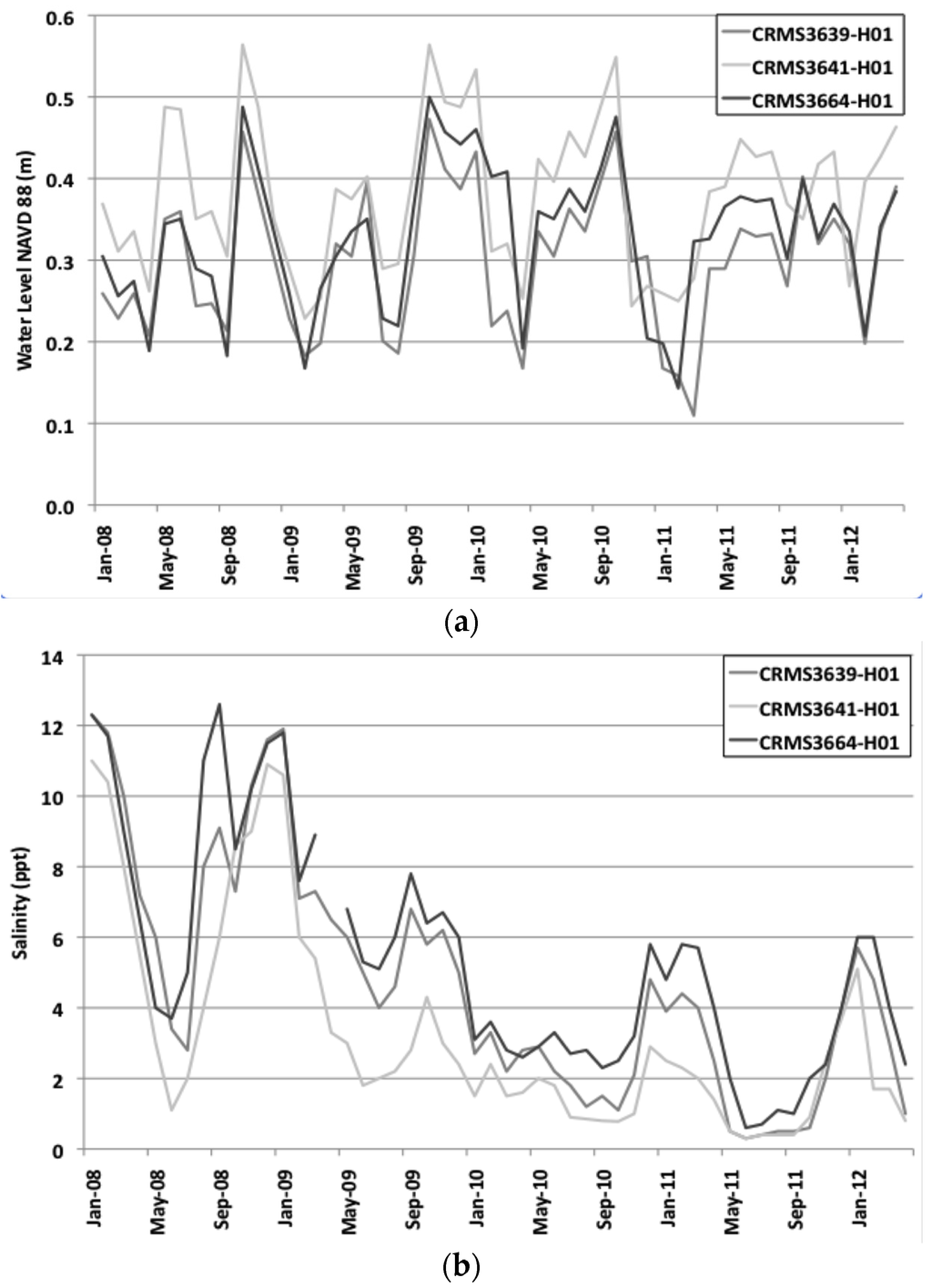 Surface water level (NAVD 88; a); and surface water salinity (b) measured at three Coastwide Reference Monitoring System (CRMS) sites in the CWU.