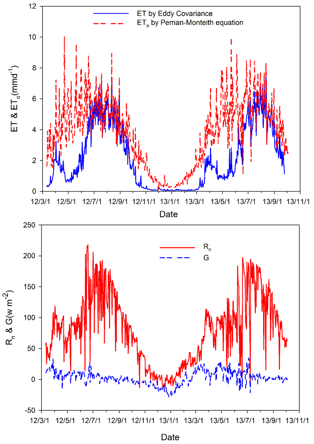 The azimuth angle of the CSAT3 sensor is 50° from true north. The maximum height of the crop is approximately 70 cm, which ensures that the EC systems maintain an appropriate footprint. The data were measured at a frequency of 10 Hz and the fluxes were computed in half-hour. Energy closure was used to evaluate the quality of the measurement data. The net radiation (), , sensible heat () and latent heat () were all obtained through the EC systems. The slope of the energy balance equation () for this site in 2012 and 2013 was 0.72 (,) [38]. The ratio was similar to the values obtained in previous studies (0.70–0.90) [7]. Thus, the data can be regarded as reliable, considering the influence of the plastic mulch to the energy transport between the soil and atmosphere [56]. The calculated ET and variation of radiation and soil heat flux are shown in Figure 2.