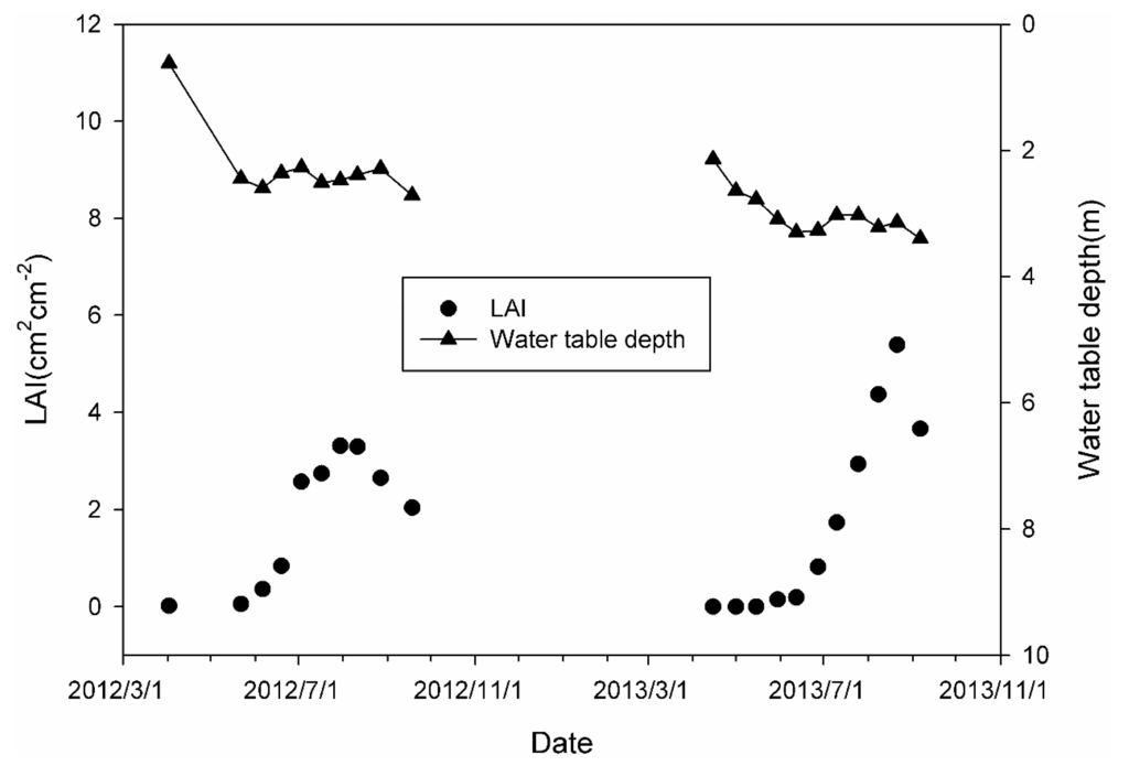 The capillary rising parameters (a1 = 320.8, a2 = 303.2, a3 = −0.15, a4 = 7.55 and b1 = −0.16, b2 = −0.54, b3 = 2.1, and b4 = −2.03) and deep percolation equation ( = 408, = −0.0173) are adopted from Liu et al. [34]. LAI and water table depth are shown in Figure 3. The spring flush was applied in March, and the initial water table depth was approximately 1–2 m in April, decreased to approximately 3–4 m in June and varied in the drip irrigation period from June to August during the two experimental years.