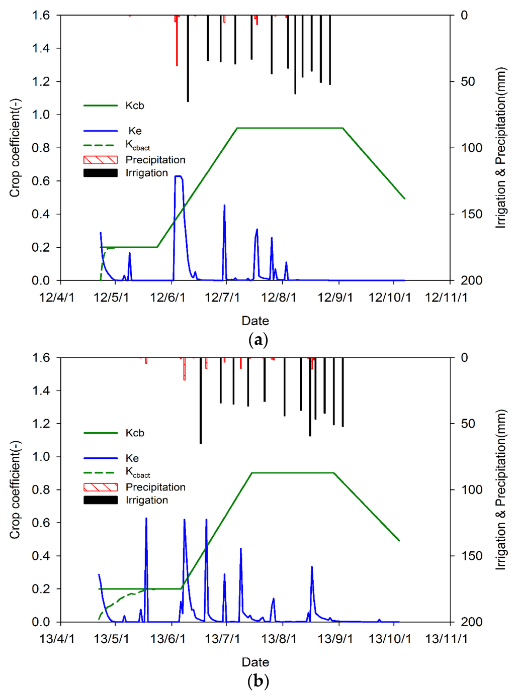 The model considers the different influence of irrigation and precipitation on the variation of soil evaporation. The is divided into two parts, , where is the soil evaporation coefficient induced by irrigation and precipitation that raise soil moisture, and is the soil evaporation coefficient induced by the precipitation only [57]. The effects of crop height, crop density, and canopy architecture on were calculated through the density coefficient () [24,32].
