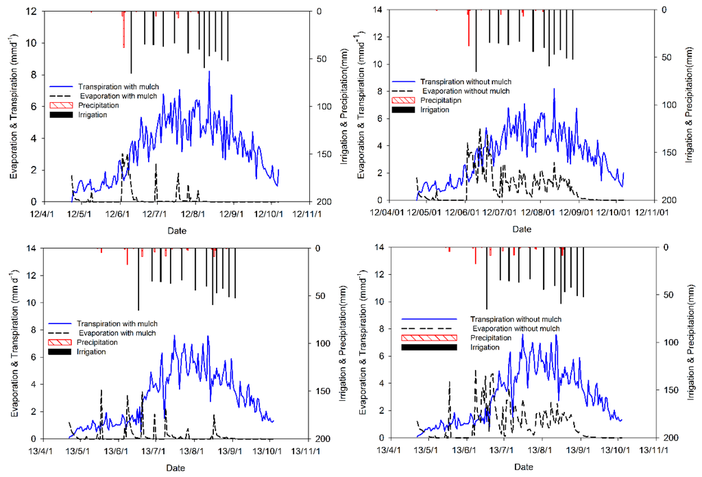 values under plastic mulch cover were 549.2 mm and 495.0 mm in 2012 and 2013, respectively, and 545.2 mm and 493.2 mm without mulch cover, respectively. No significant difference was detected. values under plastic mulch cover were 23.5 mm and 33.9 mm, in 2012 and 2013, respectively, and 163.1 mm and 170.8 mm without mulch cover, respectively. Thus, increased by approximately 139.6 mm and 137.0 mm without mulch cover. For the entire growing season, the components of were approximately 96% under plastic mulch and 77% without mulch in 2012; the components of were approximately 94% and 74% in 2013, respectively.
