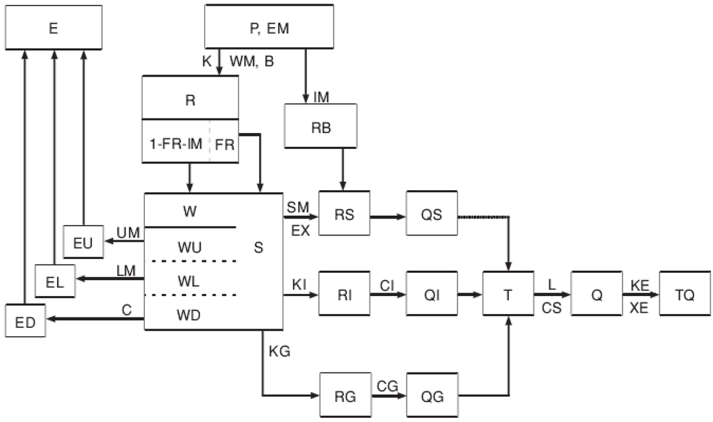 The inputs to the model are areal mean rainfall, P, and measured pan evaporation, EM. The outputs are the discharge, TQ, from the whole basin and the actual evapotranspiration, E, which includes three components, EU, EL and ED. The state variables are the areal mean tension water storage, W, and the areal mean free water storage, S. The areal mean tension water W has three components, WU, WL, and WD, in the upper, lower and deep layer, respectively.