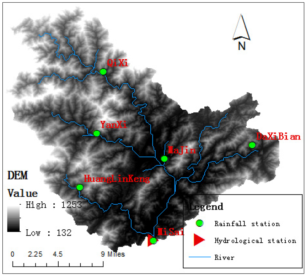 The Misai Basin (118.0° E and 29.10° N) located in southeastern China is selected for this study. The watershed drains an area of 797 km2. It has a humid climate and the mean annual precipitation is about 1800 mm. There are one stream gauge and six rainfall gauging stations in the basin (Figure 2).