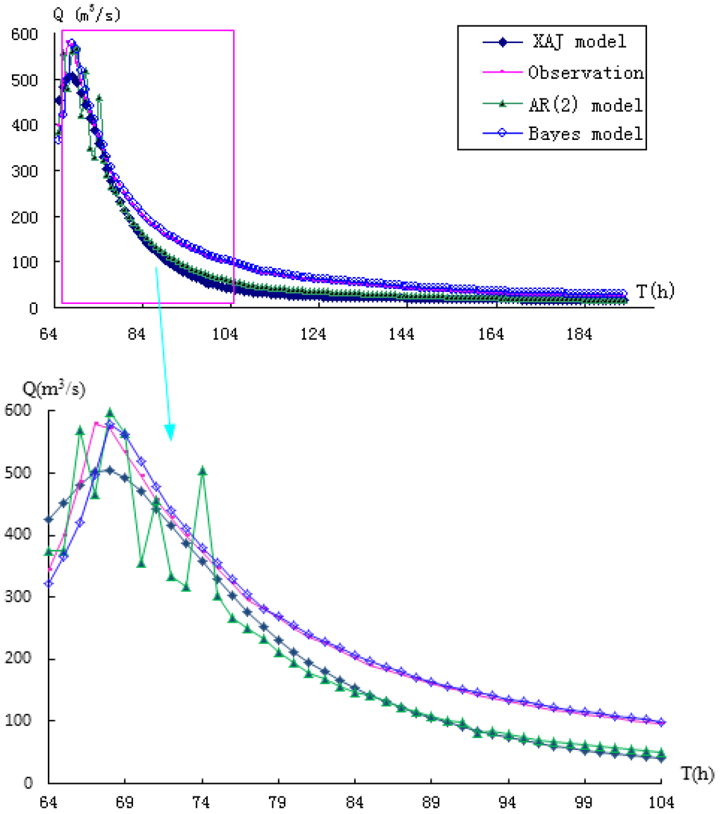 Flood events are named according to their starting dates with the flood ID in the format YYYYMMDD. The first four digits denote the year, the middle two the month, and the last two the day, respectively. Taking the flood 19820619 as an example, the observed and simulated results by the three models are compared in Figure 3. It indicates that BSRCM predictions could match the observation better than AR(2) predictions.