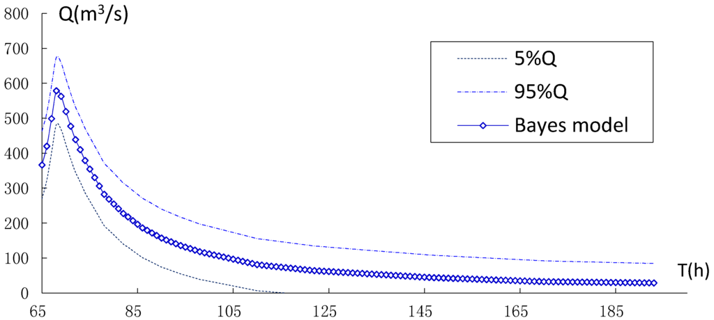 The BSRCM provides not only the correction mean results, but also the uncertainty information about corrected results, such as the corresponding quantile of a specific probability, confidence interval of different confidence levels, posterior density and distribution of discharge at any time. Figure 4 shows the 90% confidence interval of the flood 19860707. The 5%Q denotes forecasted hydrograph of 5% quantile, while 95%Q denotes the forecasted starting hydrograph of 95% quantile, and thus the zone between the two lines is the 90% confidence interval.