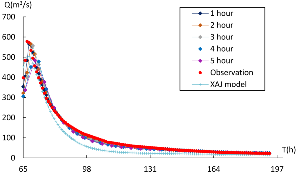 Table 3 lists the statistical correction results of all flood events with five different lead times. Results show that the deterministic coefficients of real-time correction show a decreasing trend along with the increase of lead time. All deterministic coefficients are greater than 0.90 except for the flood event 19830529 with a lead time n = 5 hour. It indicates that the BSRCM can produce good real-time correction results for flood forecasting even with long lead times.