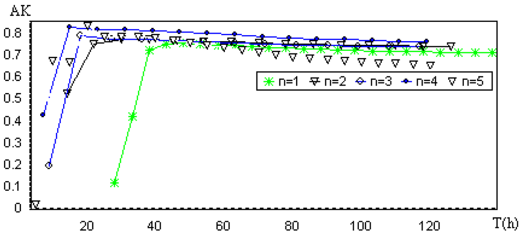 Variation of AK for different forecast lead times during real-time correction of a flood forecast.
