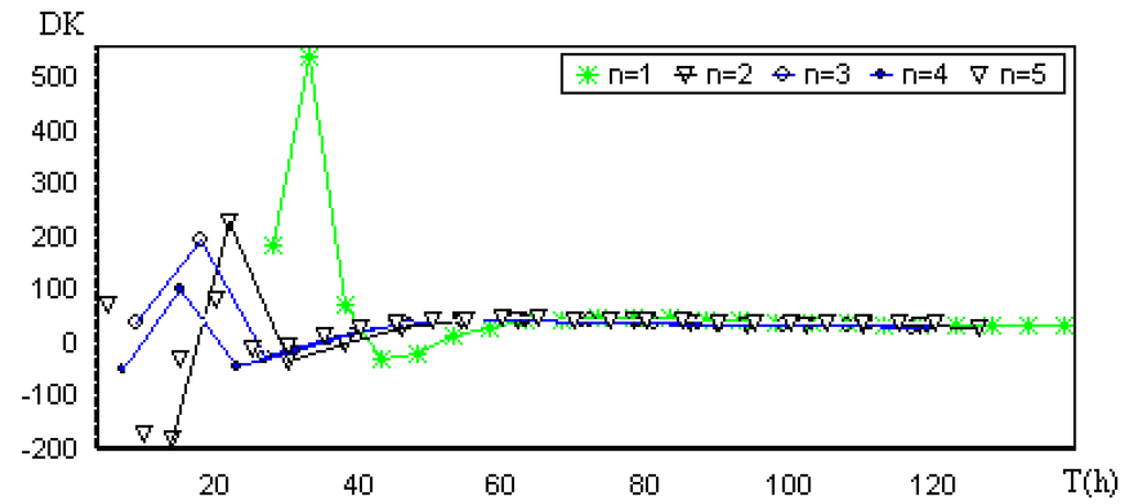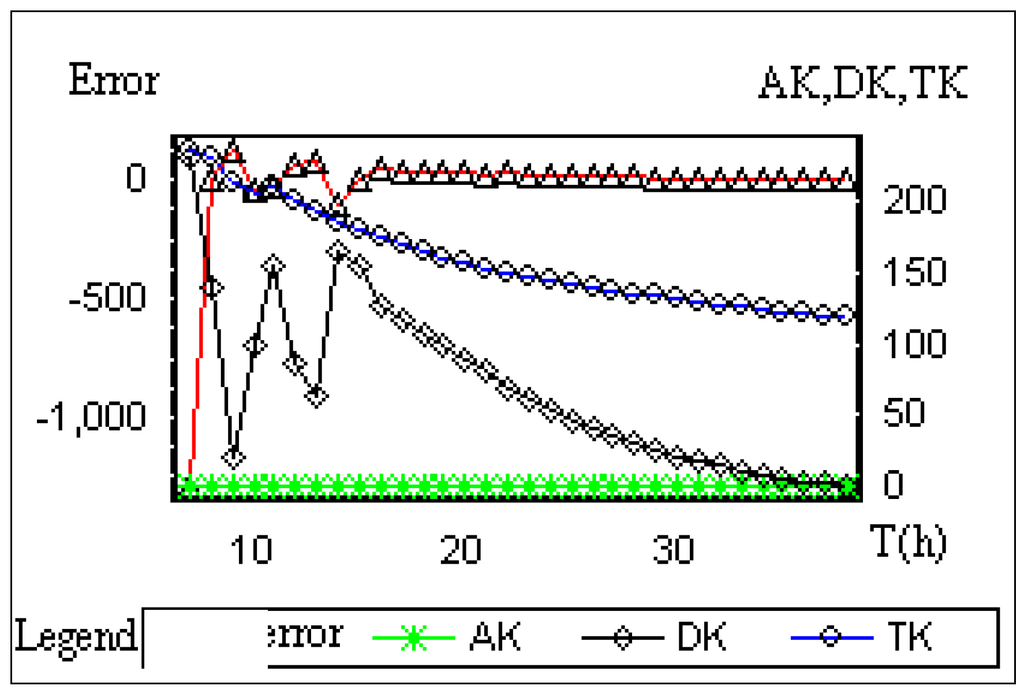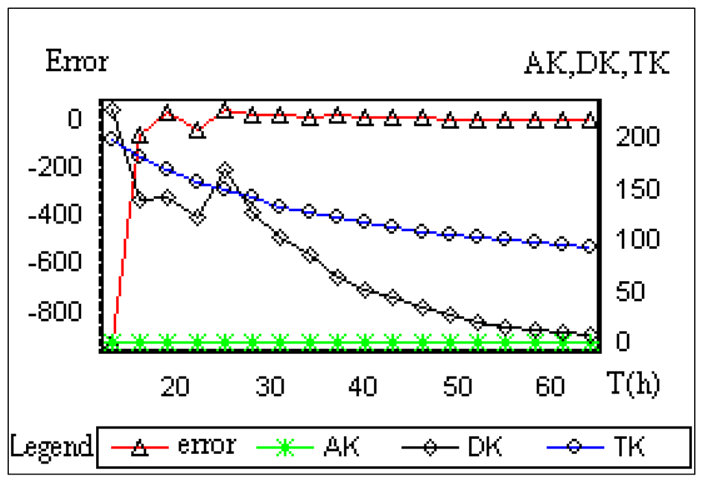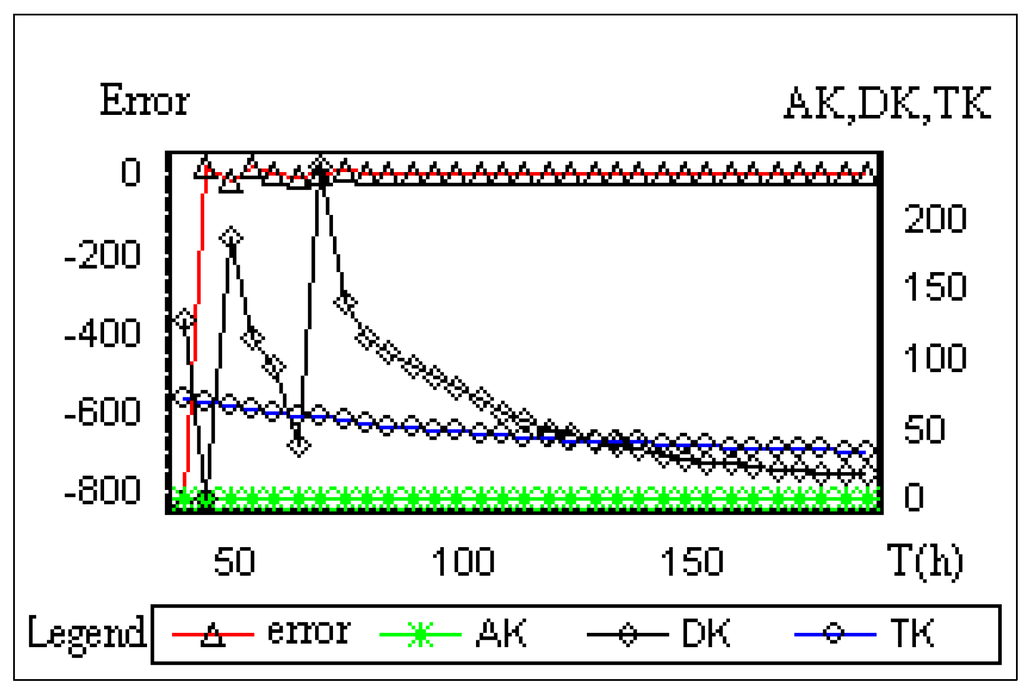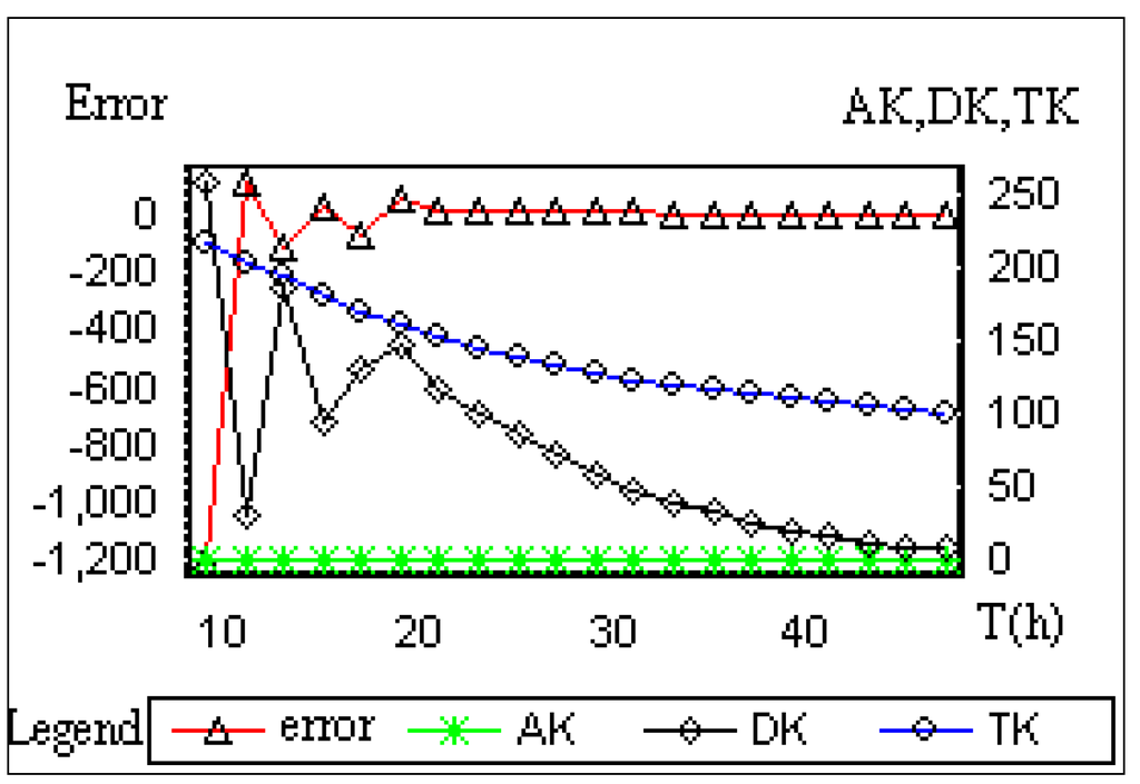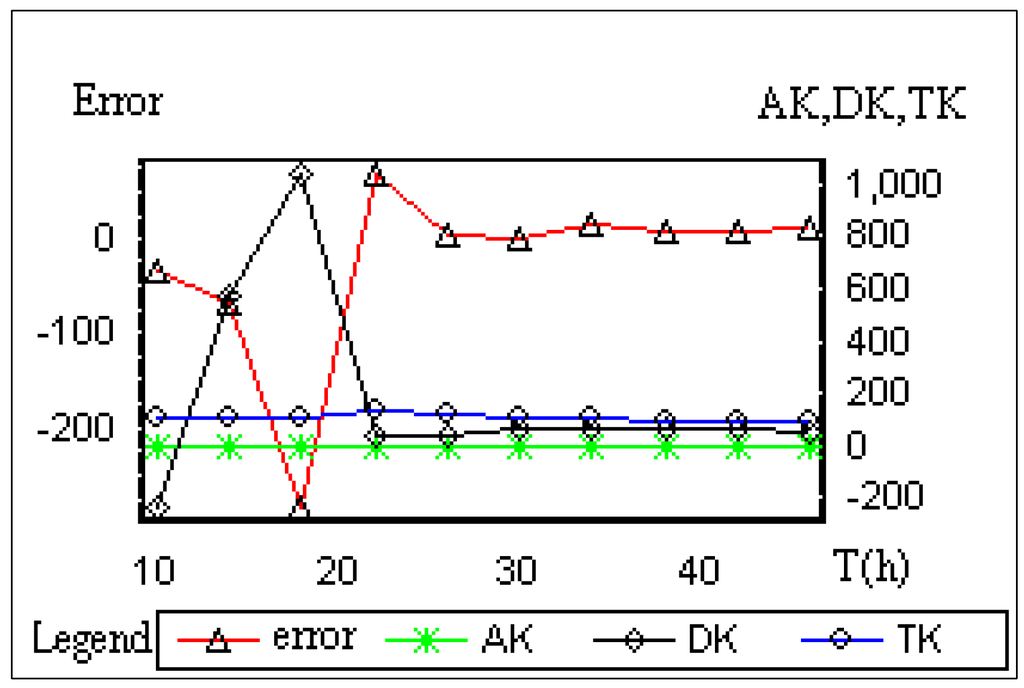 The variation of the error and the parameters (AK, DK and TK) as a function of the lead time from one to five hours is shown in Figure 11, Figure 12, Figure 13, Figure 14 and Figure 15. It indicates that the error of real-time correction reduces with simulation time, and the corrected results approach the observed discharge values closely. Taking Figure 11 as an example, in the early stages of the real-time correction, the real-time correction error is large and reaches almost −300. By T = 20 h, the real-time correction error rapidly reduces and approaches zero. When T > 20 h, the real-time correction error essentially equals zero and is stable over time. The other three cases also indicate the similar behaviors of the error.