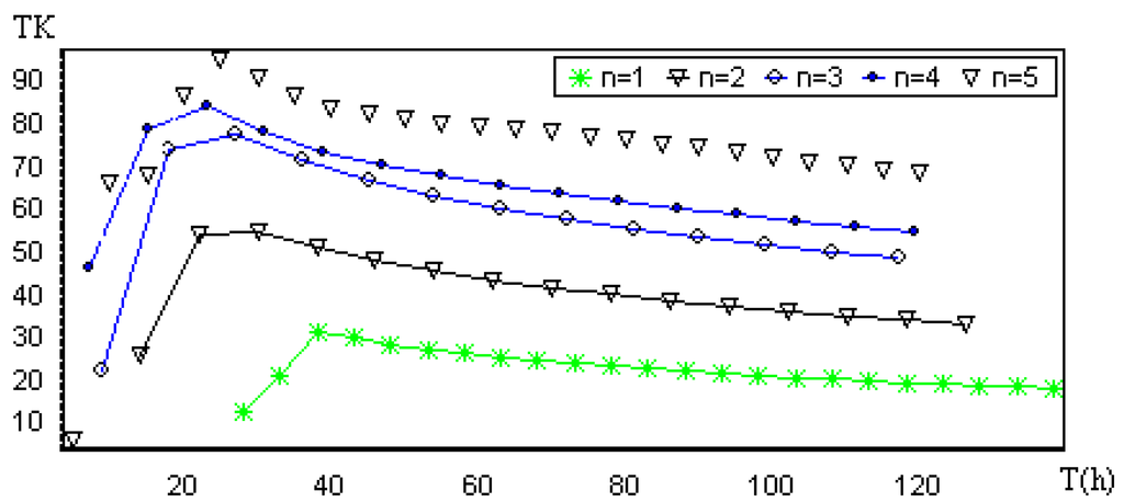 Variation of TK for different forecast lead times during real-time correction of a flood forecast.