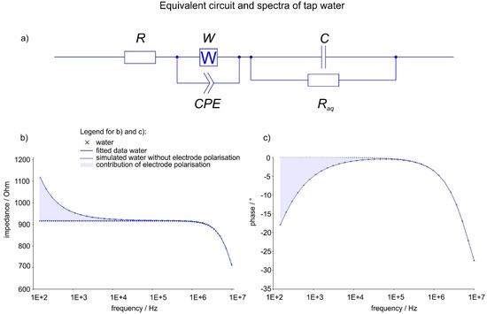 (a) Equivalent circuit; (b) exemplary impedance Z; (c) phase spectra (φ, subfigure c) of tap water incl. fitting results. R, W and CPE are resistance, Warburg impedance and constant phase element simulating electrode polarization and ion migration; C and Raq the capacitance and resistance of tap water.