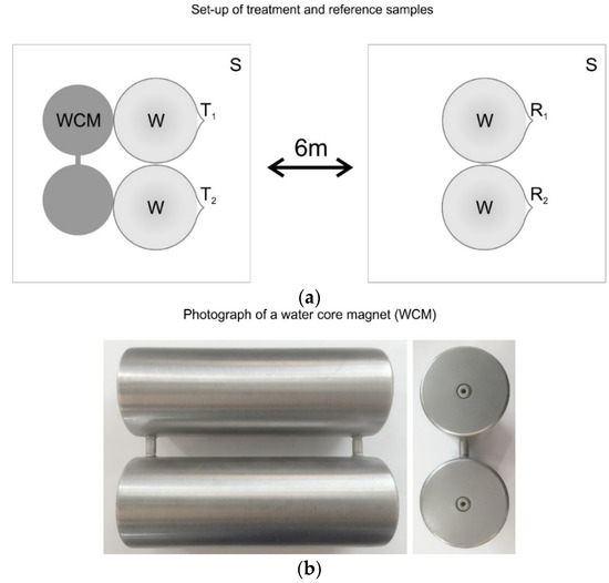 (a) Sketch showing the set-up for the treatment and the reference; S: plastic base (table), WCM: water core magnet, W: watch glass covering the beakers, T: treated beakers, R: reference beakers. (b) Water core magnet treatment device type DZKL (cylinder radius 2.25 cm, height 15 cm, distance between cylinders 1 cm).