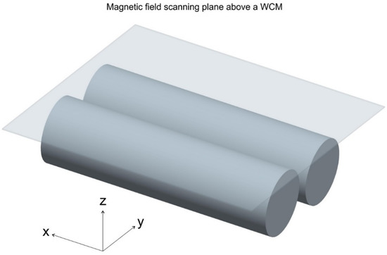 Magnetic fields of the WCMs were measured with a magnetometer (VGM, AlphaLab, Inc., Salt Lake City, UT, USA) mounted via a 30 cm long Plexiglas rod on a XYZ stage. This stage consisted of two Thorlabs LTS 300/M translation units for X and Y, and one LTS 150/M for the Z direction (Thorlabs GmbH, Dachau/Munich, Germany). The whole set-up was mounted on a TMC anti-vibration plate (75SSC-103-12 TMC Vibration control, TMC, 15 Centennial Drive, Peabody, MA, USA). The WCM to be scanned was put on a Plexiglas plate atop a wooden table. An area of 20 × 20 cm2 was sampled with steps of 1 mm, 5 mm above the double cylinders (see Figure 3). Before each measurement, the sensor was zeroed inside a zero Gauss chamber (ZGC, AlphaLab Inc.) that reduces the environmental magnetic field (Earth field) to near zero (<0.002 G). Each point was repeatedly measured until all values (x, y and z direction of the magnetic field) would not differ more than 5% from each other in two subsequent measurements. The magnetic fields were then visualized by mapping the absolute values of the X, Y and Z components onto the RGB color space in each point. This procedure is described in detail with the example of a bar magnet in the results section.