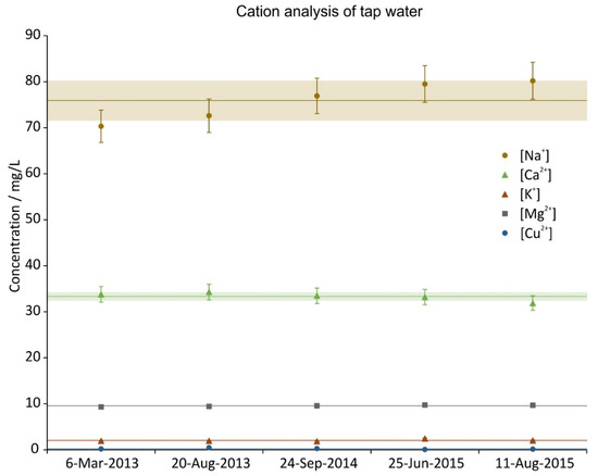Cation concentration of 5 random tap water samples during the investigation period. The error bars show the precision of the measurement (5%), the lines are the averages and the shaded regions depict the standard deviations over the 5 samples.