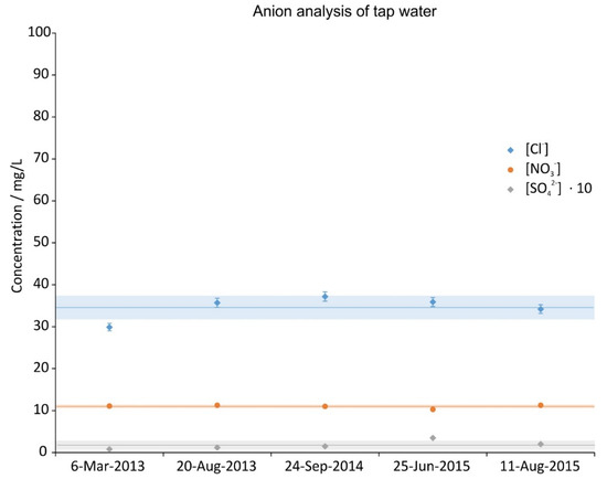 During the time period of the experiments five random tap water samples were taken and analysed. The concentration of their constituents is given in Figure 4, Figure 5 and Figure 6. The data was split in three graphs to increase their readability. In all graphs the same scale on the ordinate was chosen for reasons of comparison. Next to the ions shown, NO2-, PO43−, Fe2+, Fe3+ were also investigated; their concentrations were below the LOQ (<0.05 mg/L). The analysis shows that the ion concentrations were fairly constant throughout the whole period (2.5 years).