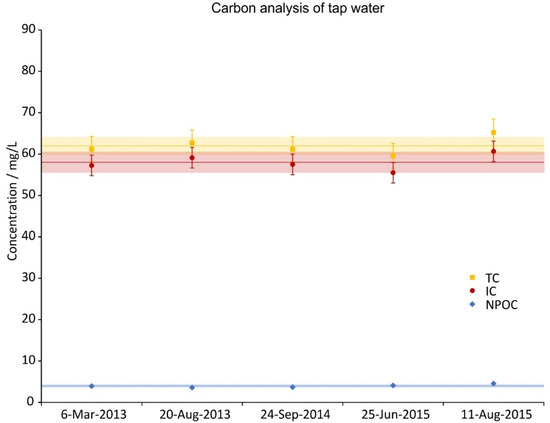 Total carbon (TC), inorganic carbon (IC) and non-purgable organic carbon (NPOC) concentrations of 5 random tap water samples during the investigation period. IC was calculated from as difference of TC and NPOC. The error bars show the precision of the measurement (5%), the lines are the averages and the shaded regions depict the standard deviations over the 5 samples.