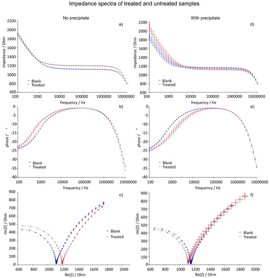 When no micro precipitation was present in the beakers before and after the treatment, the impedance of the treated sample increased at high frequencies (case a, see Figure 11a–c, increase of Raq in Table 2). Because fewer ions are available in the solution due to DOLLOP formation, there is less electrode polarisation at low frequencies (smaller phase shift in Figure 7b at low frequencies and decrease of Aw (ion diffusion constant) and C in Table 2).
