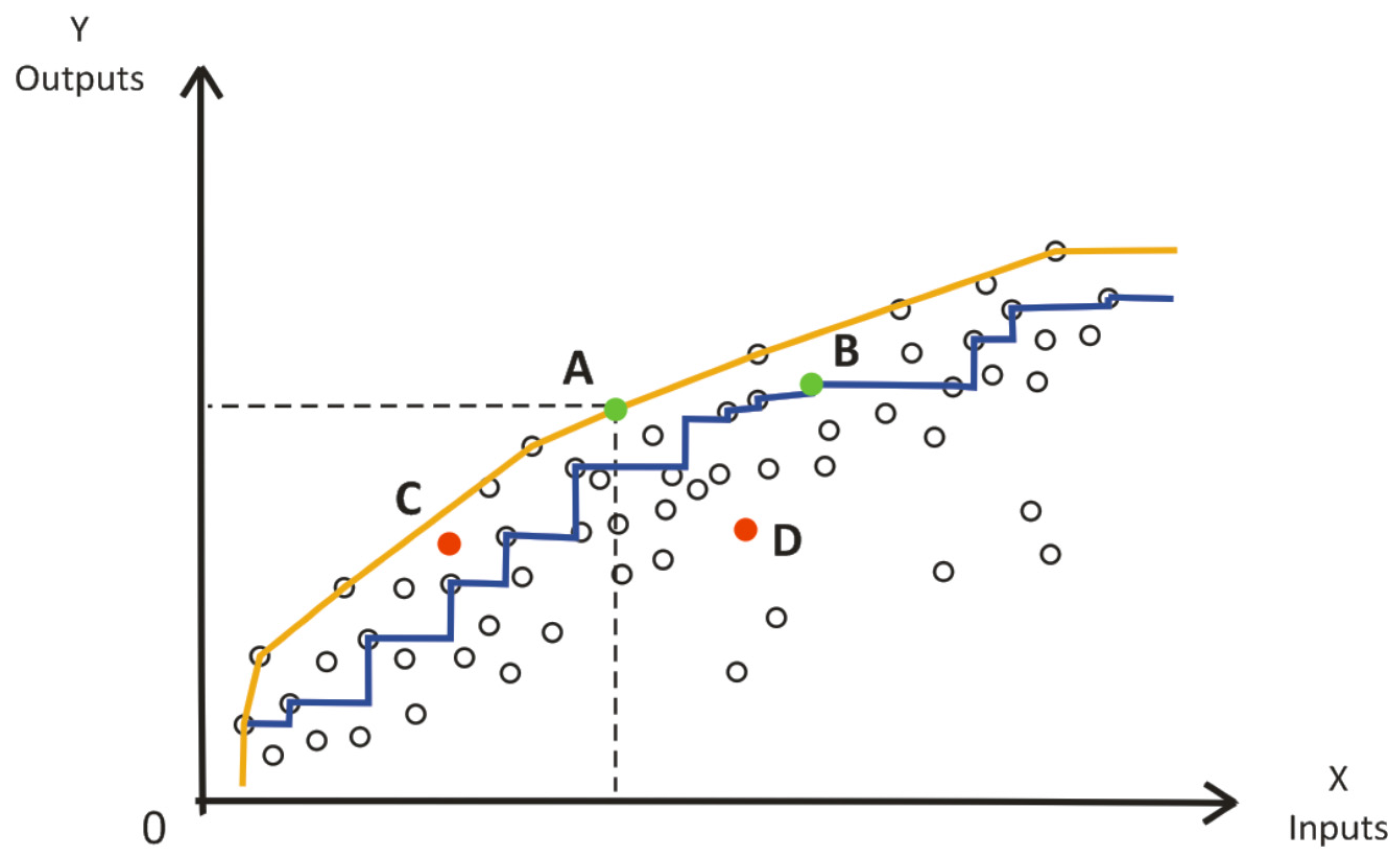 Figure 1 provides an example of a partial frontier and of a full frontier method. Observations A and B are efficient relatively to the full frontier and partial frontier, respectively. Observation C is only inefficient for the full frontier and observation D is inefficient for both frontiers.