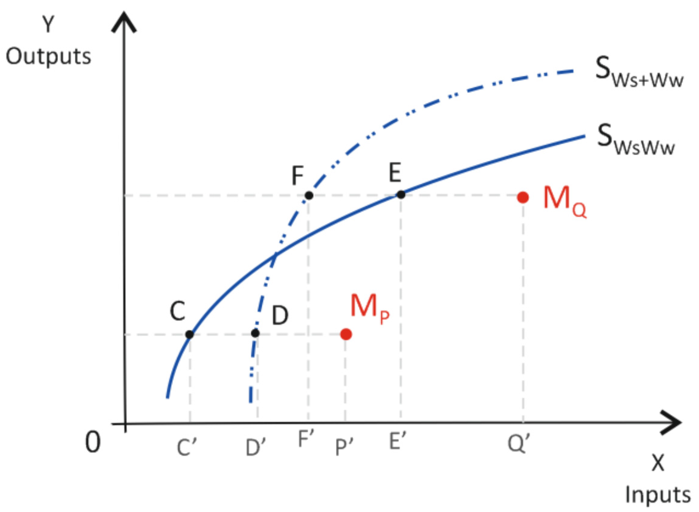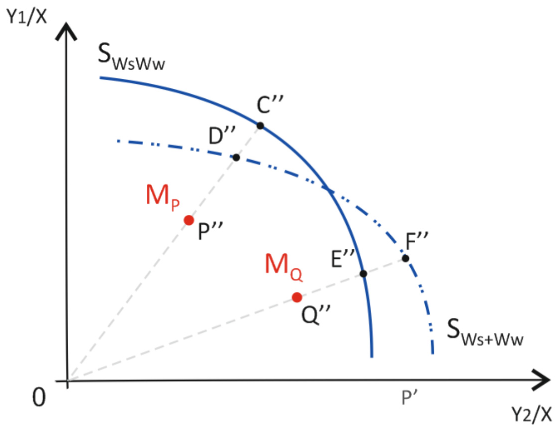 Separate production frontiers (SWs+Ww) and joint production frontiers (SWsWw) in the output-output space.