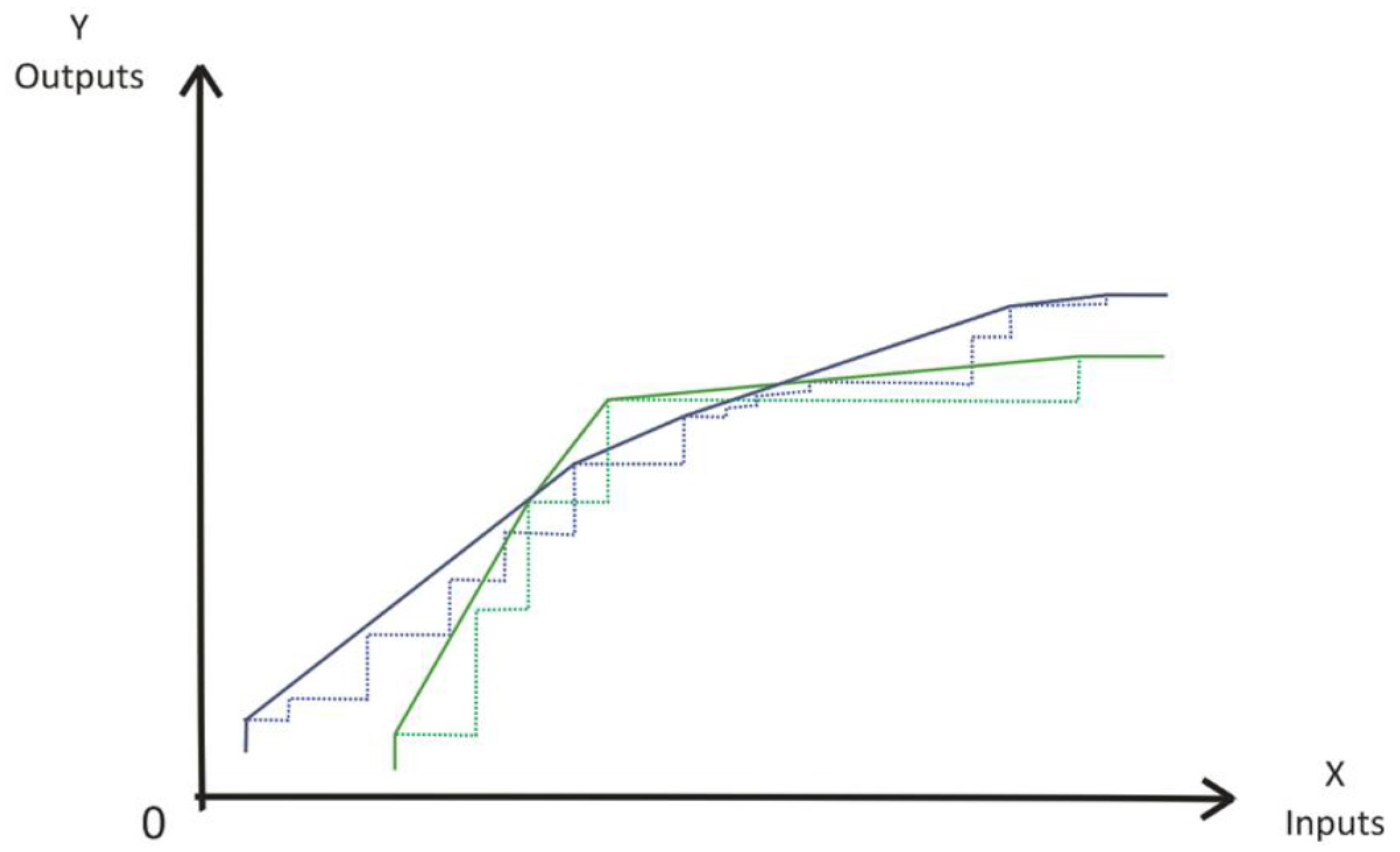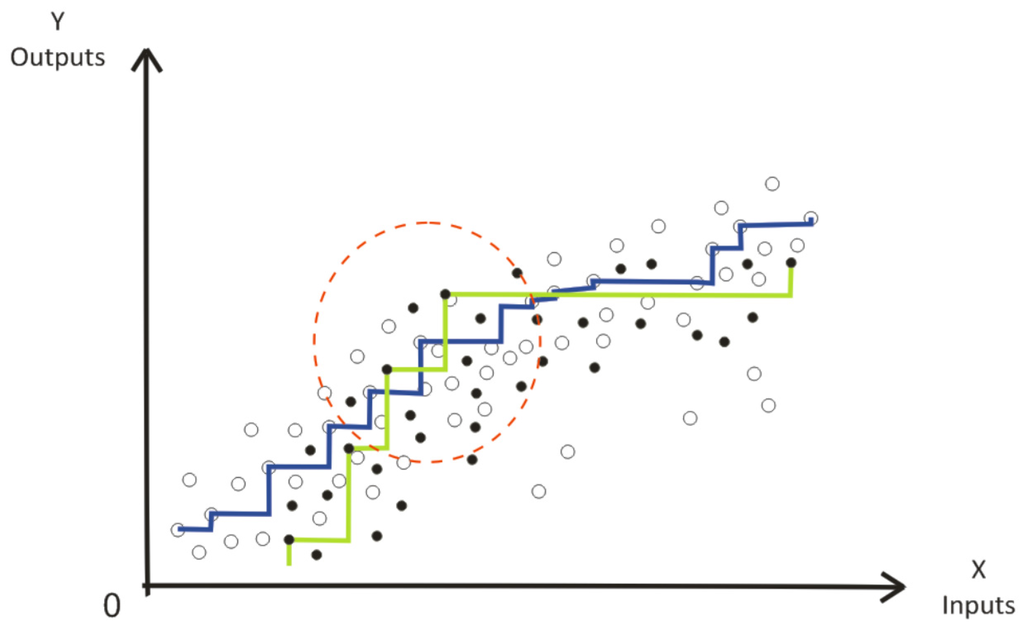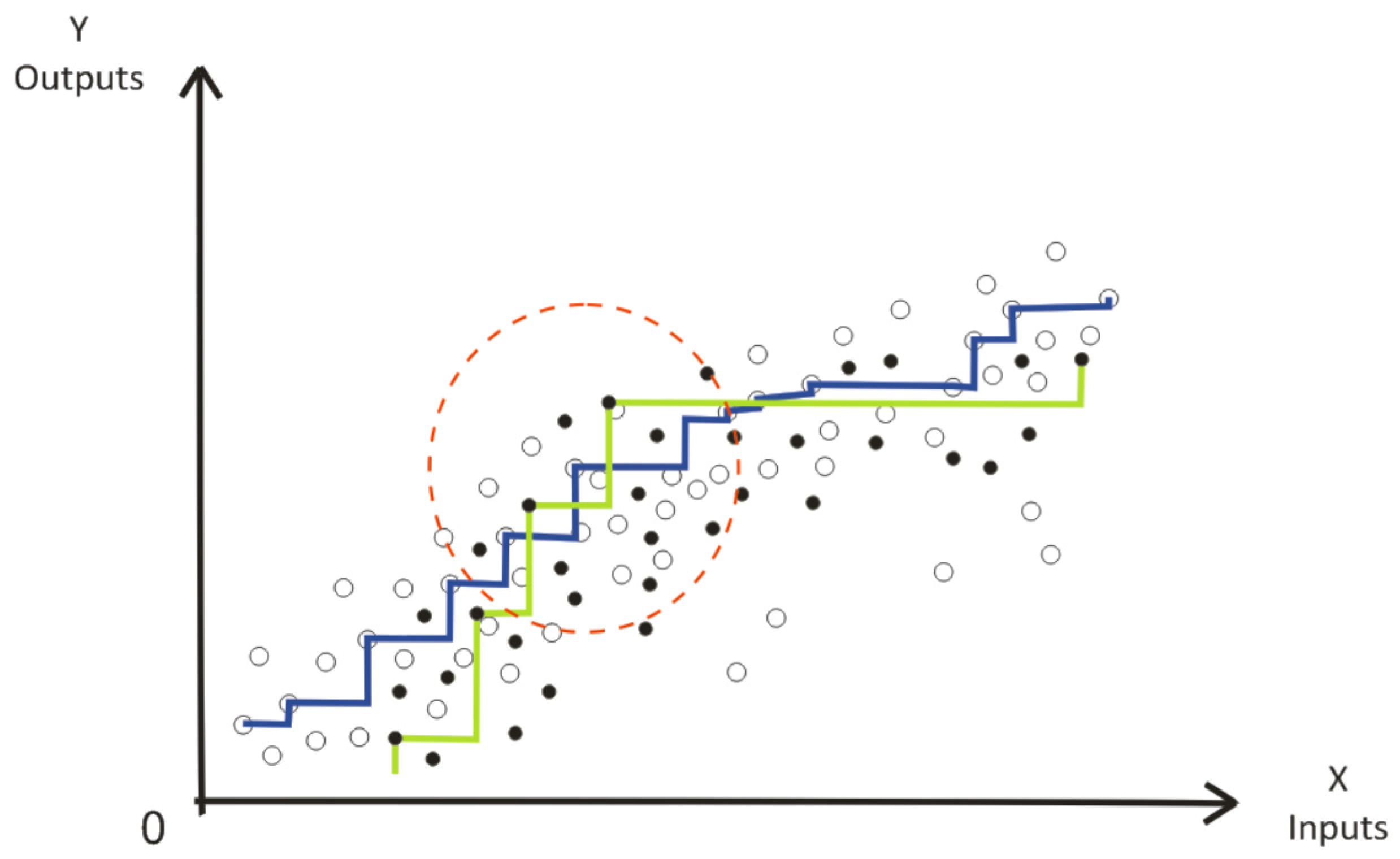 To evaluate the consistency of economies of scope, we estimated the previous ratios for each multiproduct firm by using robust order-α efficiencies for different values of α. We estimated the various order-α frontiers of the groups of multiproduct firms and fictitious separate firms and compared them. However, since these frontiers are irregular (Figure 1), and to avoid situations as the one illustrated in Figure 4 within the red circle, where it is hard to assess the dominance of a frontier over the other, we applied the DEA method to linearize order-α frontiers of the two groups of firms (Figure 5) (instead of linearizing order-α frontiers as in Carvalho and Marques [29]; in which the convexity of the production set is not imposed). This procedure was performed by excluding the super-efficient firms (that is, the firms that are above the order-α frontier) in the corresponding order-α frontiers and then estimate the DEA frontier of firms only located below the order-α frontier.
