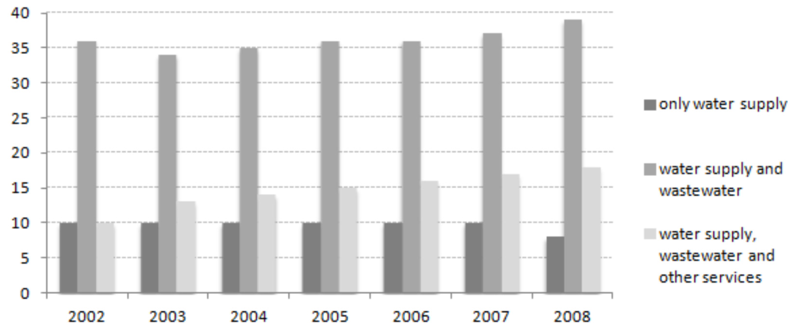 So, from the proposed methodology we investigated the presence of economies of scope among water utilities (Ws) and water and wastewater utilities (WsWw) in Portugal. The sample is made up of 67 water utilities of the retail segment for the period between 2002 and 2008, covering almost 63% of the Portuguese population. Altogether the sample is composed of 39 WsWw utilities, 10 Ws utilities and 18 water utilities that provide water supply, wastewater, and other services, such as solid waste collection. From the latter utilities, and from the WsWw utilities, were built Ww fictitious utilities, drawing from these utilities the inputs and outputs corresponding to the wastewater activity. This simplification was done in order to apply the proposed methodology, which requires the existence of all types of utilities in the market study: utilities that provide only one of the outputs and utilities that provide all outputs. Note that over the period studied some water utilities have changed concerning the services provided. Figure 6 shows the distribution of observations according to the types of services provided during the period studied.