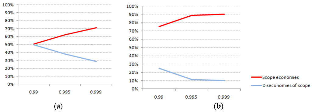 The results obtained are very encouraging demonstrating the potential of the proposed methodology compared with the other methodologies usually applied in the literature of nonparametric methods. Although the second methodology (which allows the analysis of the influence of the exogenous variables on the production process) is not the most appropriate one to investigate economies of scope, it has also been used in the literature to explore such economies [40]. We argue that the methodology proposed is the most useful since it enjoys all the advantages of the recent partial frontier nonparametric methods. It is a robust tool to investigate economies of scope because it allows us to assess the influence of extreme observations and outliers on the results and does not face the problem of the “curse of dimensionality”, especially when α is farthest from the unit. In addition, our methodology is closer to the definition of economies of scope because it compares the production function of firms that produce two or more goods with the production function of firms that produce only one good. Moreover, not only does it provide an overview of the whole sample but it also enables the evaluation of each observation, and allows us to further assess the robustness of the results obtained by varying the value of α. The results obtained in the simulated case study proves the usefulness and potentiality of the methodology. These results show that if only full-frontier non-parametric methods (such as DEA) were used, we would have concluded quite the opposite. That is, we would have concluded for the predominance of economies of scope when, in fact, diseconomies of scope prevail. The results obtained by the proposed methodology demonstrate that this is caused by 9% of extreme observations, which use a very small amount of inputs and also produce a low level of outputs.