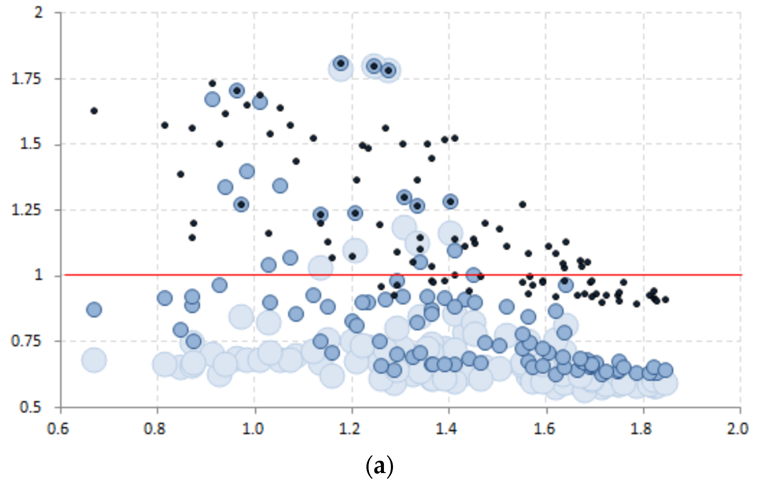 From the proposed method it is demonstrated that as the frontier of utilities AB moves towards the full frontier () will dominate the frontier of utilities A+B and, consequently, the number of utilities with economies of scope increases. According to the results in a CRS situation and when 9% of utilities AB are above the frontier of the joint production (), 80% utilities AB show diseconomies of scope (Table 6). However, when the frontier of multioutput utilities AB moves towards the full frontier (for the ), leaving only 1% of the utilities AB above the frontier, the number of utilities AB with diseconomies of scope drops to about 45% (Table 6). An analysis considering a VRS situation proves that, in fact, the diseconomies of scope dominate as it gets closer to the full frontier (Table 6 and Figure 8). This means that if partial frontiers had not been applied in a CRS situation and, if only full frontiers were applied (such as DEA), we would have concluded the opposite, the predominance of economies of scope, which would not correspond to reality. After an analysis of the sample it was found that 9% of the utilities AB (which are above the frontier ) are actually extreme observations which consume a very small amount of inputs and also produce a low level of output; therefore, considering them leads to the opposite conclusions.