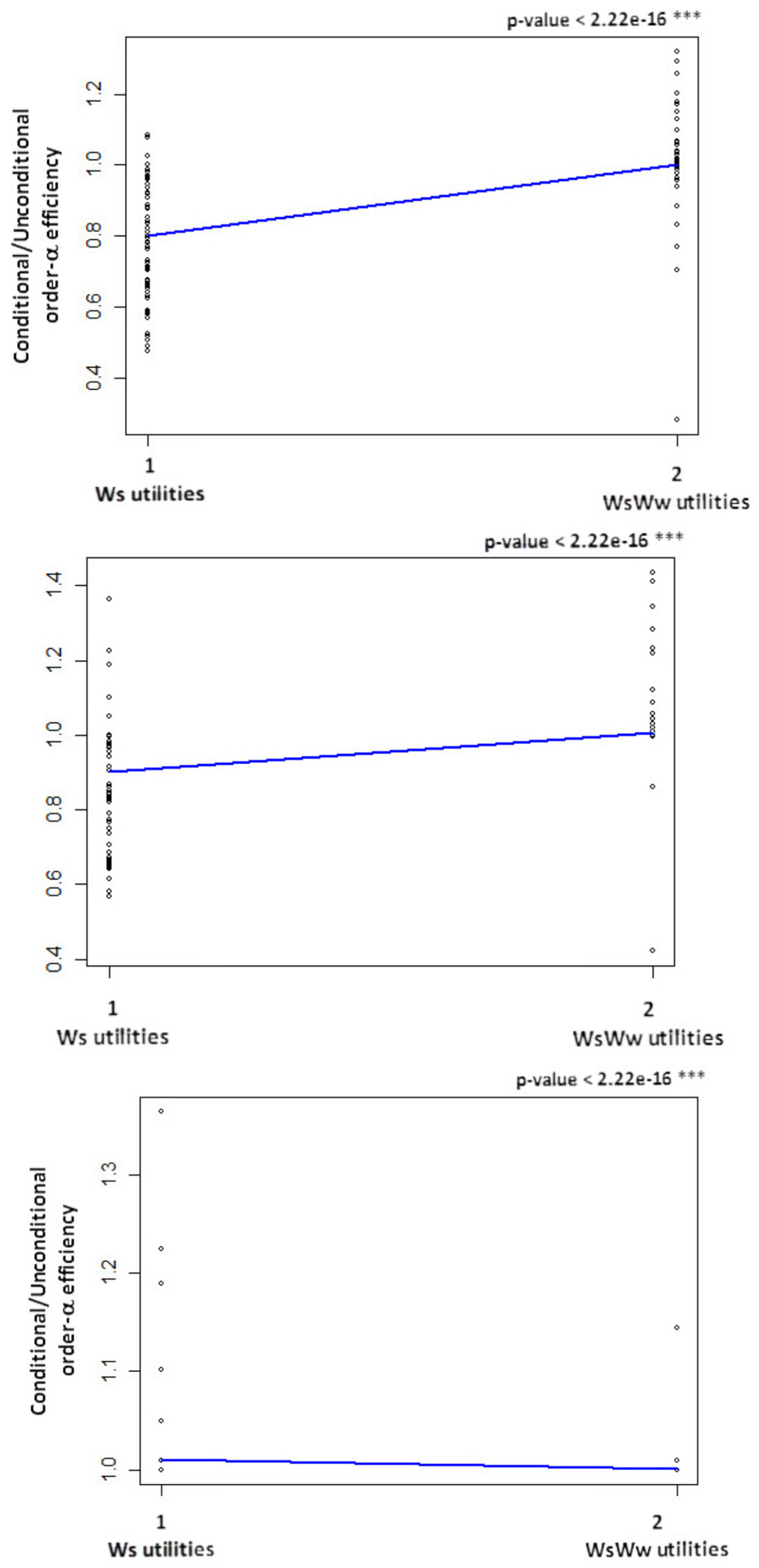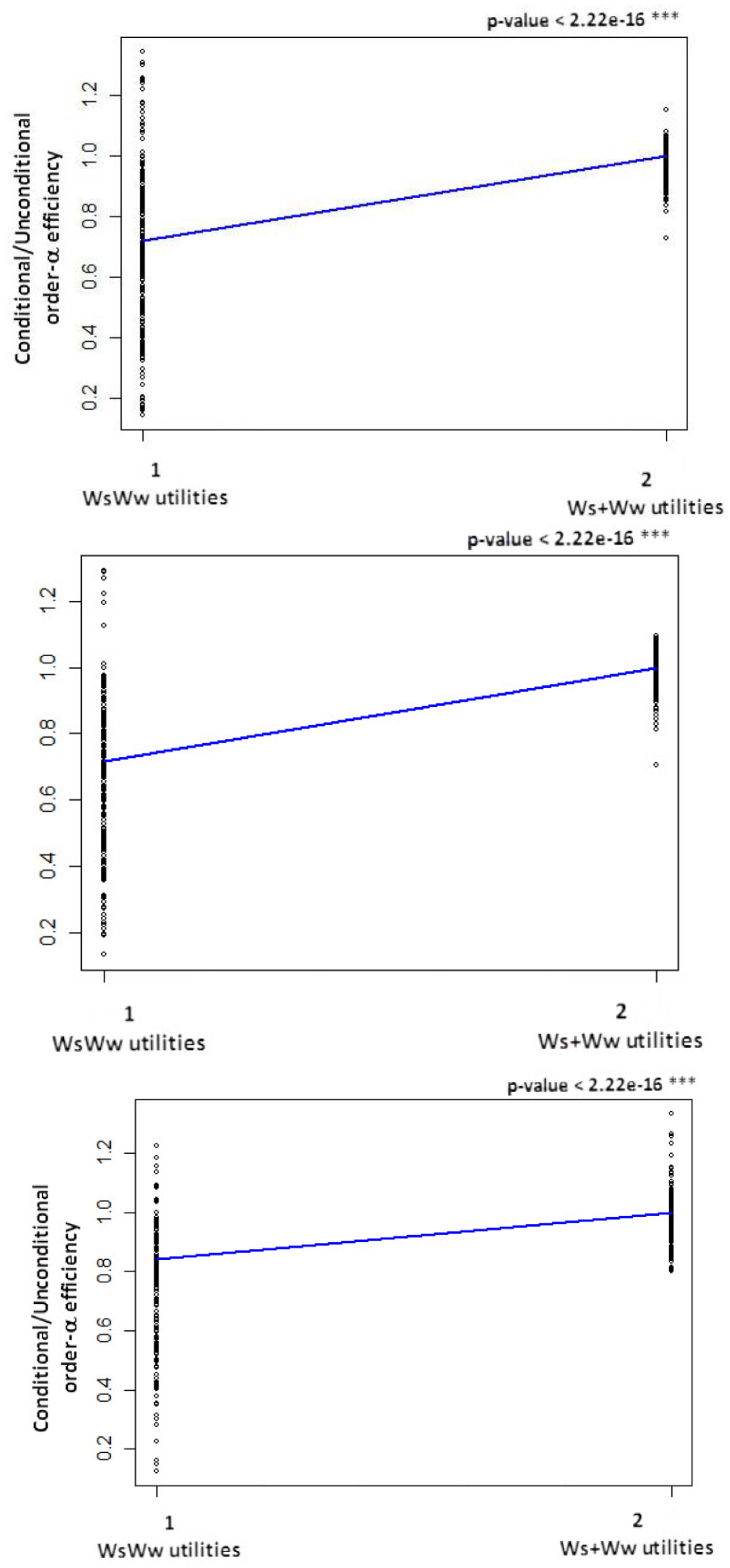 For the case study of the Portuguese water sector the results show that the frontier of the WsWw utilities dominates mostly the frontier of the Ws+Ww utilities for several α values, since the average of (as is its median) is always greater than one (Table 5). This means that WsWw utilities with economies of scope predominate (considering the order-α quantile frontier (α = 0.999) of the separate utilities and the order-α quantile frontiers (α = 0.99, α = 0.995 and α = 0.999) of the group of joint production firms). For example, for the case where the order-α quantile frontier of the separate utilities (Ws + Ww utilities) is α = 0.999 and the order-α quantile frontier of the group of joint production firms (WsWw utilities) is α = 0.995, on average, WsWw utilities must reduce their inputs by about 2.8% (1–0.972) to reach the frontier of separate utilities (Ws + Ww utilities); that is, to become as efficient as separate utilities (Ws+Ww utilities), while reaching their own frontier, they will have to reduce their inputs by about 17.0% (1–0.830). Conversely, if the order α-quantile frontier of the group of joint production firms (WsWw utilities) move to an α = 0,999, on average, WsWw utilities need to further reduce their inputs by about 22.8% (1–0.772) to become efficient in relation to their own group of utilities (WsWw ). This means that WsWw utilities are, on average, more efficient than separate utilities (Ws+Ww utilities), which means that there are economies of scope in providing these two types of services for these values of α.