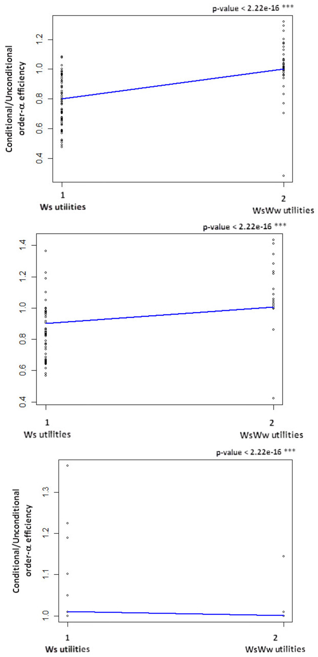According to the results presented in Figure 9 and Figure 10, the simultaneous provision of water and wastewater services is favorable to performance (at the 99% confidence level), displaying the existence of economies of scope between these activities. When studying the influence of the exogenous variable “type of utility” on the production process of the WsWw multiproduct utilities (1) and the group of fictitious utilities (separate utilities) (Ws+Ww) (2), the existence of economies of scope is clearer. The presence of economies of scope becomes more pronounced (steeper nonparametric regressions) as we move away from a unit value for α. This was also observed in the second analysis when the influence of the exogenous variable on the production process of the real utilities, Ws utilities (1) and WsWw utilities (2) were investigated. However, this second analysis leads to opposite conclusions for higher values of α or, in other words, when it coincides with the full FDH frontier. This may be directly related to the fact that two different types of utilities are compared in this second analysis, particularly a group of multiproduct utilities (WsWw) with a group of utilities that provide only one service (water supply) and that can, therefore, be responsible for skewing the results. This means that this analysis may not be the most appropriate one to find economies of scope, because it compares two completely different types of utilities, some utilities are characterized by an output while others are characterized by two outputs.