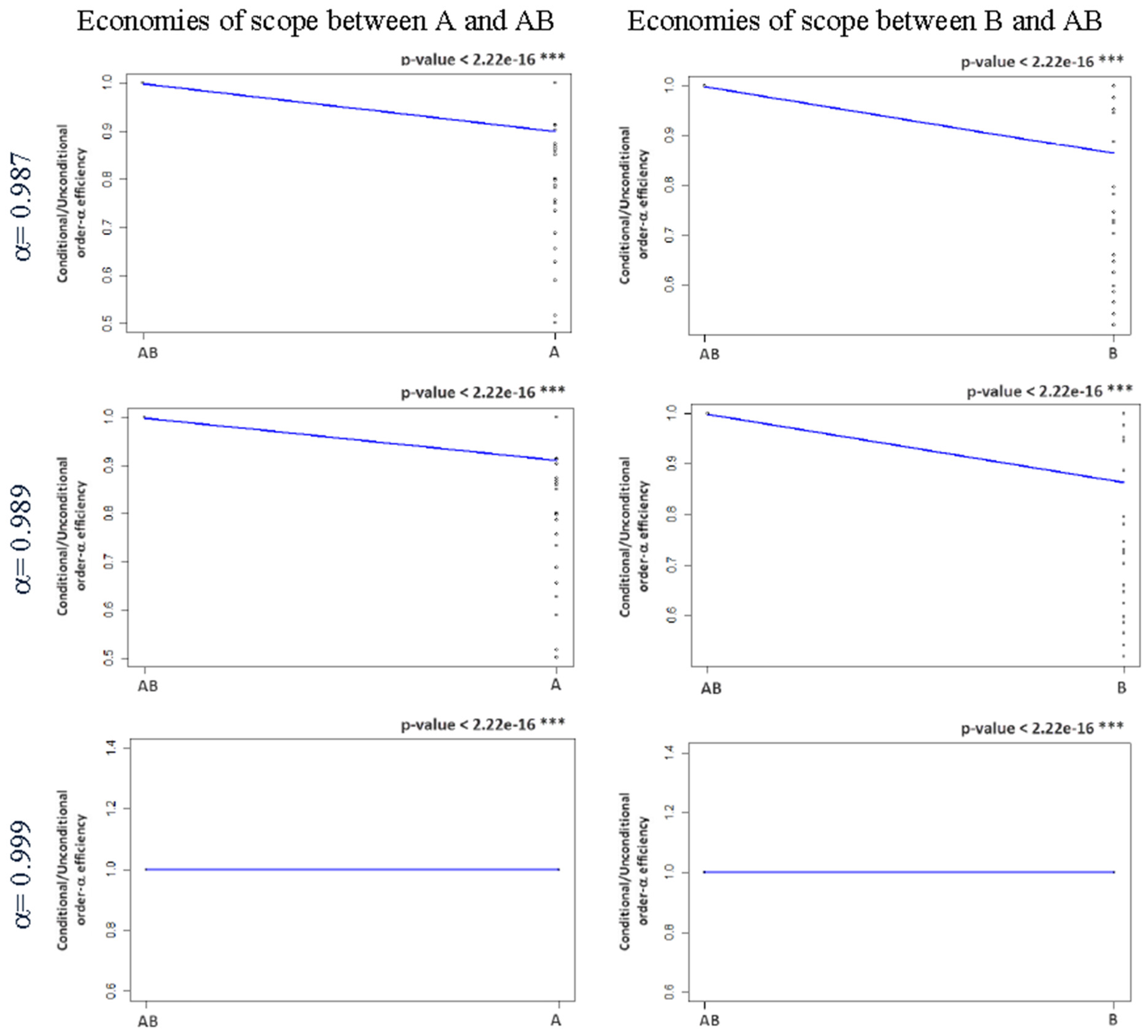 Nonparametric regressions estimated to investigate economies of scope between AB and A+B for frontiers α = 0.987, α = 0.989, and α = 0.999 of utilities AB and for frontiers α = 0.999 of utilities A+B. Kernel regression significance test: *** 0.001, ** 0.01, and * 0.05).