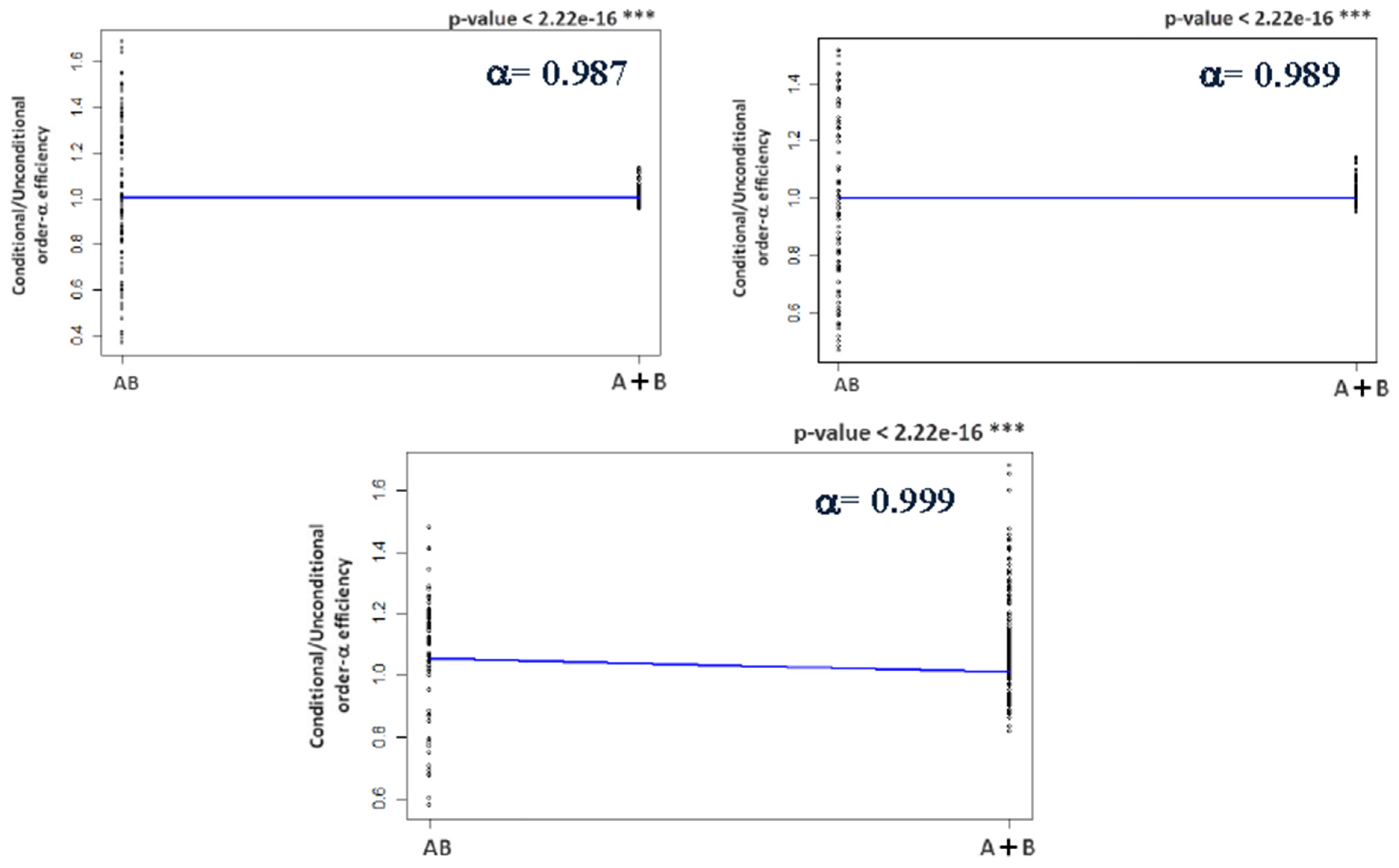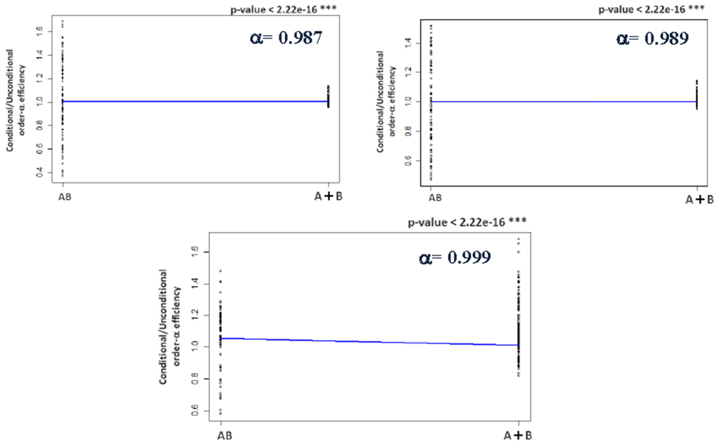 Thus, the order-α efficiency estimates are done by previously fixing the quantity (probability 1 − α) of observations that are above the frontier. An observation operating at the level with an order-α input efficiency score is efficient at the level , being dominated by the observations producing more outputs than y with a probability 1-α. Additionally, an observation with an order-α input efficiency score has to reduce its inputs to the level to reach the input efficient frontier of level . In contrast, if indicates that the observation can increase its inputs by factor to reach the same frontier, being considered as super-efficient with respect to the order-α frontier. The order-α efficiency converges to the FDH efficiency score when [19].