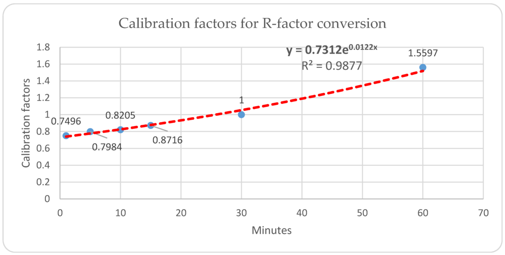 In addition to the 4 calibration functions proposed by Panagos et al. [7], stations with data at very high resolution (1-min) from the Czech Republic and Slovakia have been used. The R-factor calculated with 30-min data is 0.7496 times lower than the R-factor calculated at 1-min data and 1.5597 times higher than the R-factor calculated at 60-min data. The term ‘calibration factor’ is used below to represent this conversion between the R-factor at different resolutions and the R-factor at 30-min. Based on the six calibration factors at the corresponding time resolutions (1, 5, 10, 15, 30 and 60-min), a regression function has been developed (Figure 2). The limited number of calibration factors is a source of uncertainty and the regression function should be handled with care and used only for the entire study area. The regression function allows estimating calibration factors at every temporal resolution between 1 and 60 min, though it is uncommon to use rainfall data at time resolutions different from those shown in Figure 2.