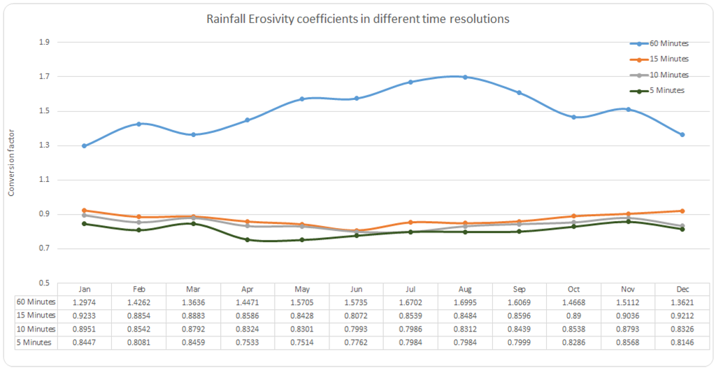 The annual calibration factor for estimating an annual R-factor by using 10-min data has been estimated at 0.8205, ranging from 0.7986 (July) to 0.8951 (January). The smoothest calibration factors (closer to 1) are found in winter. The monthly conversion factors allow us to reallocate the R-factor at the desired resolution even if the data are available at coarser resolution. For example, the August R-factors at 60-min can be converted to 5-min by multiplying them by a factor 2.13, while the January ones are multiplied by a factor 1.54 (Figure 3). In addition, the calibration factors between very high-resolution (e.g., between 15-min and 5-min) vary between 1.05–1.12 for the different months.