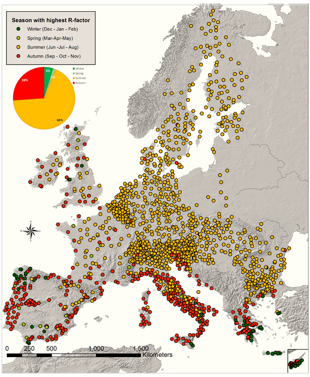 Within Europe, geographic differences exist in the seasonal patterns of rainfall erosivity. The stations with the absolute largest R-factor value in a single month (for instance July, August, September or October) are located mostly in Italy and Slovenia. For each REDES station, the season (spring, summer, autumn, winter) with the largest R-factor has been selected (Figure 5). For 94% of the REDES stations, the most erosive period is either summer (68%) or autumn (26%). For only 22 REDES stations, mainly located in South Spain and France, the most erosive period is spring (Figure 5).