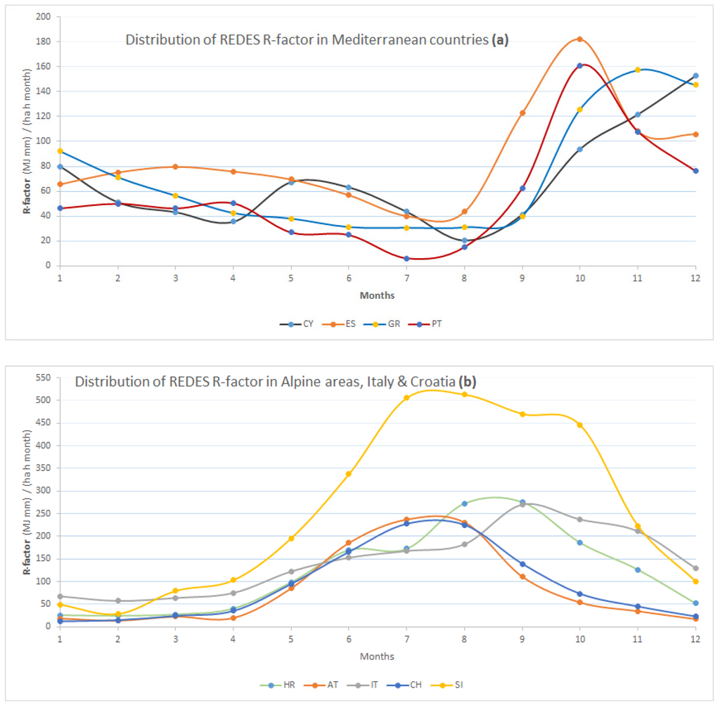 The temporal distribution of rainfall erosivity is very similar in Switzerland and Austria (Figure 6b), having the largest values in July and August. Instead, Northern Italy and Croatia show their peak values in September. These countries have the largest mean monthly values in REDES.