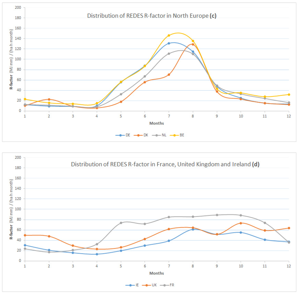 In Germany, The Netherlands, Belgium and Denmark, the rainfall erosivity is very limited during winter and early spring, then increases in May-June-July (and August in Denmark), followed by a sharp decrease in autumn (Figure 6c). The monthly R-factor distribution follows a Gaussian shape [46] in Germany, The Netherlands, Belgium and Denmark. Contrary to the three above-mentioned regional patterns (Mediterranean, Alpine, North Europe), Ireland, United Kingdom and France show the smoothest distribution during the whole year (Figure 6d).