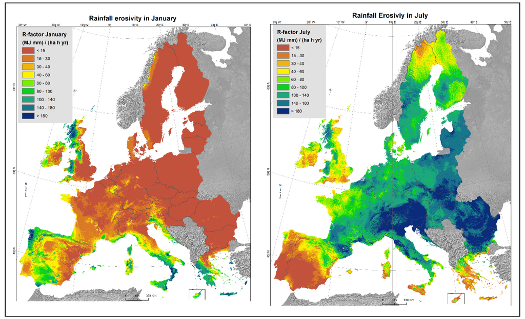 Monthly erosivity maps for Europe (Left: January; Right: July).