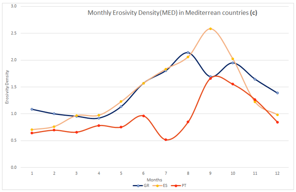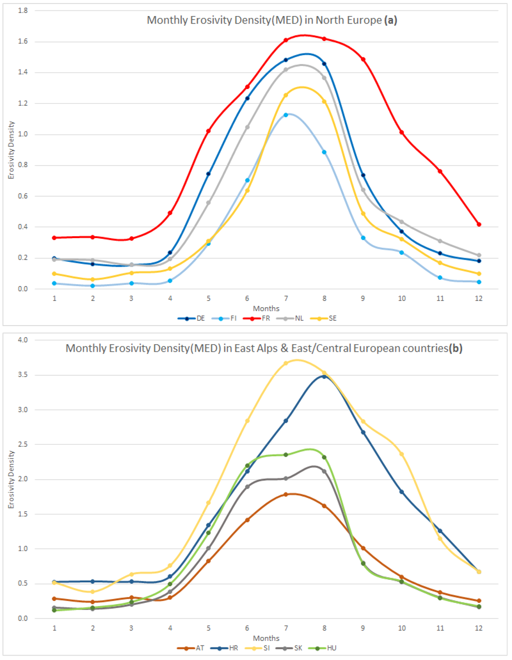 The Northern European countries show similar monthly variability regarding erosivity density (Figure 8a). The Gaussian distribution of mean monthly erosivity density is represented with the “bell-shaped curve”, increasing during May to June, reaching its largest in July and then having a sharp decrease during early autumn. In France, the larger values of MED are due to larger R-factor values in the Alpine areas.