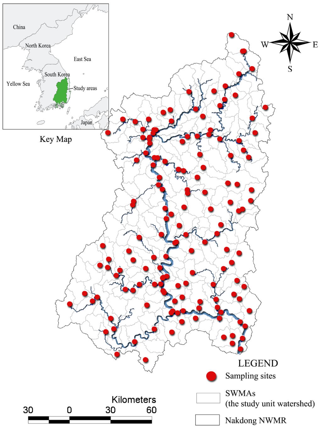 Since 2007, the Ministry of Environment in Korea has monitored various stream characteristics across the entire nation twice a year (in spring and fall) under the National Aquatic Ecological Monitoring Program (NAEMP). The variables measured include aquatic organisms in streams (benthic diatoms, macroinvertebrates, and fish), habitat quality, and various physicochemical parameters. The data generated by this program have been stored in a database in both spatial and non-spatial formats. For monitoring purposes, the NAEMP has identified and hierarchically-structured watersheds across the entire country, including the national watershed management regions (NWMRs), base watershed management regions (BWMRs), and sub-watershed management areas (SWMAs). The total number and average area of the NWMRs are 21 and 5191.74 km2, respectively; the respective values for BWMRs are 117 and 931.85 km2, and those for SWMAs are 840 and 129.79 km2 [27]. Typically, NWMRs and BWMAs fall under the purview of the national government, whereas local governments are concerned with SWMAs [11].