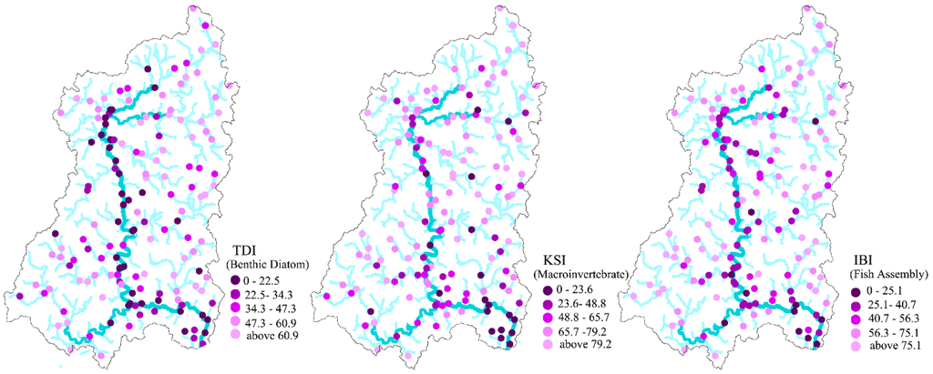 Ecological conditions measured by biological indicators, including TDI, KSI, and IBI, varied greatly among sampling sites (Table 2). Very low biological indicator values (near zero: very poor ecological condition) were observed at some sites, while others had very high values (near 100: very good ecological condition). The mean values of the TDI, KSI, and IBI within the study area were 43.27, 63.19, and 56.89, respectively. Overall, the condition of macroinvertebrate assemblies in the study areas was slightly better than the condition of benthic diatom or fish assemblies. The standard deviation of KSI values suggested greater variance in KSI values than in TDI or IBI values. Interestingly, all indicators reflected poor ecological conditions along main streams and in downstream areas in the southeastern part of the study region (Figure 2).