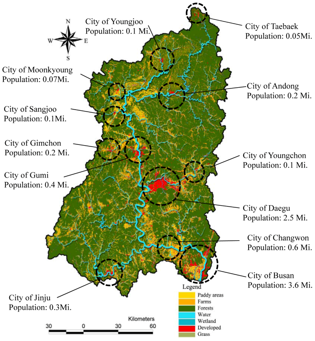 The relative proportions of each type of land use in watersheds also varied greatly across the study areas. The dominant land use type in the study area was forest (mean: 63.64%). Developed areas were relatively small, and concentrated at several sites along the main river, particularly near the central and downstream regions (Figure 3). As shown in Figure 3, several cities of various sizes were located near/along the main stream. Daegu and Busan were the two largest cities, with populations of 2.5 million and 3.5 million, respectively.