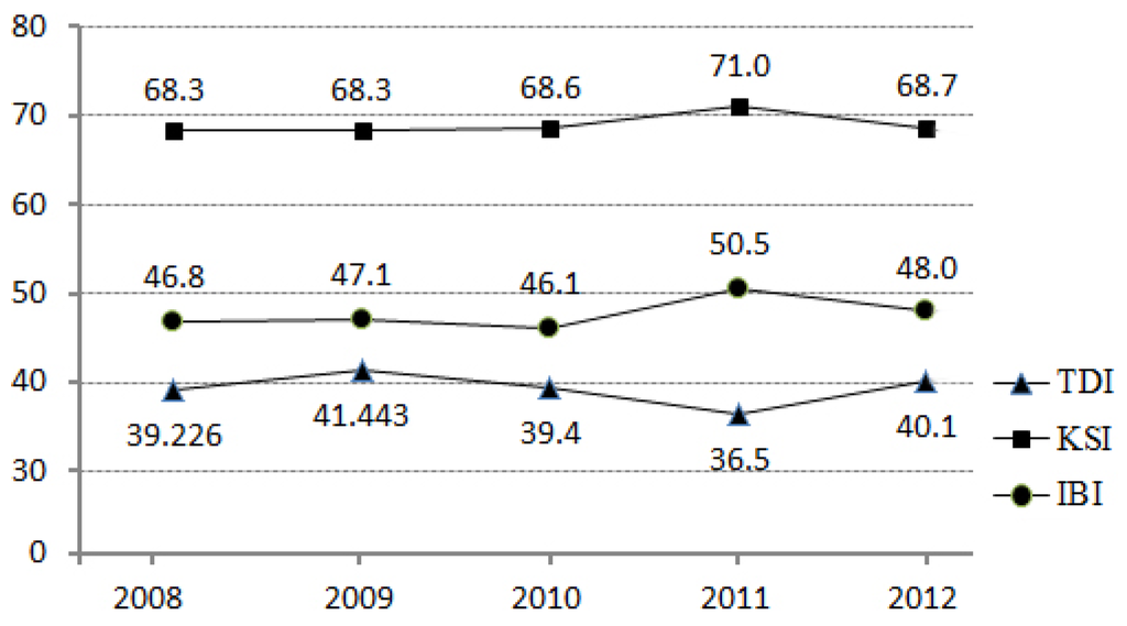 Before we undertook a detailed analysis, we considered the changes of the biological indicators over the five years from 2008 through to 2012 to understand the nature of the dataset (Figure 4). In 2011, there were changes in the biological indicators. KSI and IBI had slightly higher values, while TDI had slightly lower values, than the other years. Despite this fluctuation in the biological indicators in 2011, we used 2011 monitoring data to match with the most up-to-date land use/land cover data released by the Korean Ministry of Environment. Thus, there is a possibility that models estimated using datasets for other years might be slightly different from the model estimated using the 2011 dataset.