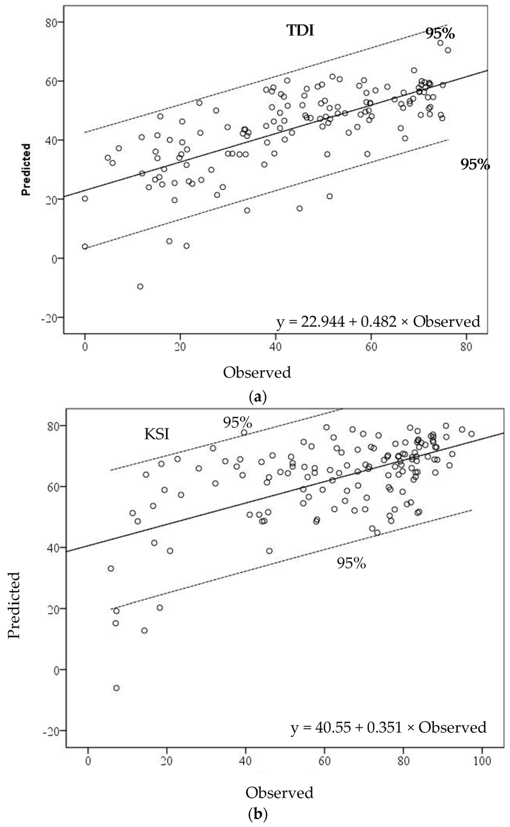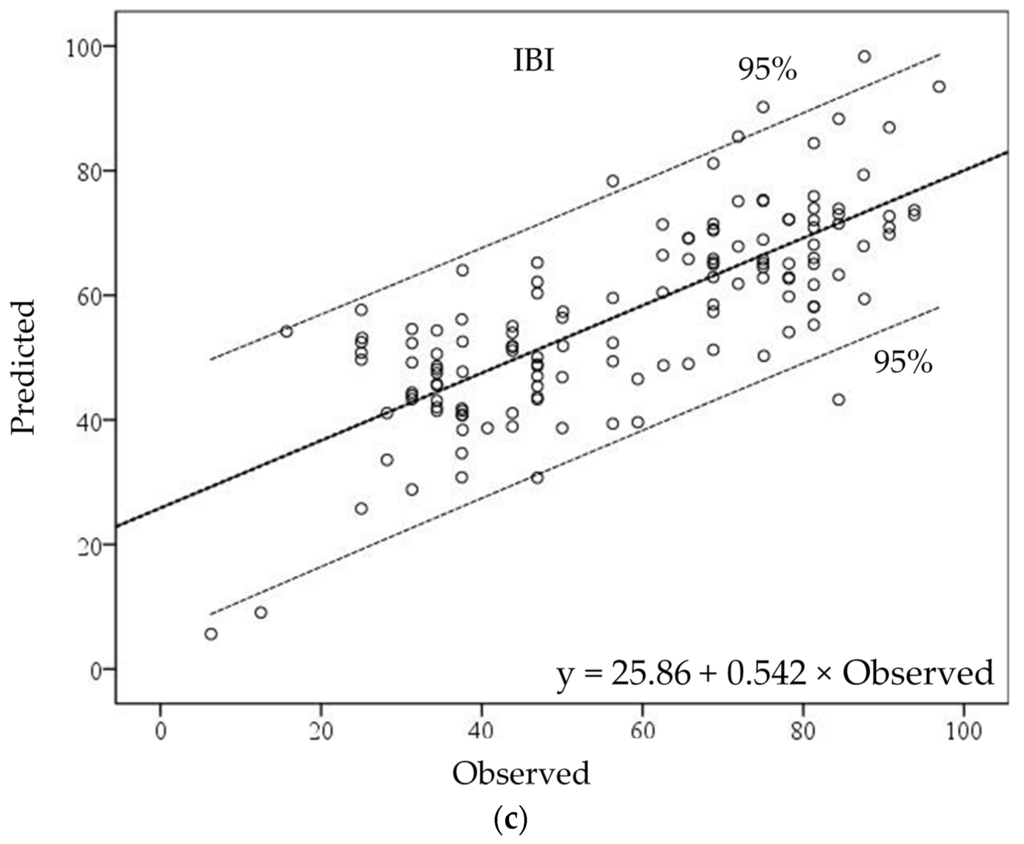 Scatterplots between observed and predicted values of the TDI local model indicate that most sites fell within the 95% confidence range of the estimated GWR model. It seemed that the observed values in the low range of TDI values were underestimated in the GWR model (Figure 5a). The KSI-GWR model showed a clear relationship in the middle–high range of KSI values. The GWR model overestimated in the range of observed KSI values from 20 to 40, while it underestimated in the range from 0 to 20. Seven watersheds were outside the 95% confidence interval (Figure 5b). The IBI-GWR model produced an even more complex estimation pattern. In the high range, three watersheds were overestimated, and one watershed was underestimated. In the middle range, one was overestimated and one was underestimated. In the low range of IBI values, two watersheds were underestimated in the GWR model (Figure 5c).