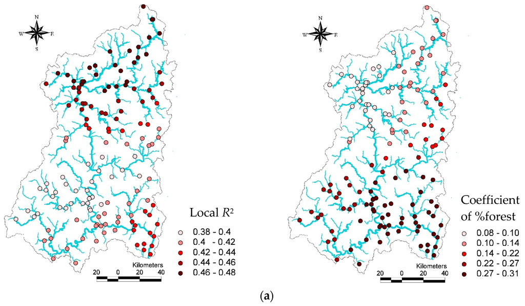 Our GWR models for the TDI and IBI strongly suggested a non-stationarity in the influence of forest in the watershed. Significant differences between the OLS and GWR models for the TDI and IBI in terms of R2, AIC, and Moran’s I values (Table 4 and Table 6) suggested a better performance of the GWR models for explaining the variance of TDI and IBI in streams. This provides strong evidence that the effects of forests on the TDI and IBI indicators were non-stationary. Magner et al. (2008) [62] reported similar results, indicating that land use effects on biological parameters in streams could vary by location due to the localized geology. In their study on grazed riparian management and stream channel responses in Southeastern Minnesota streams, they found that land use metrics had no significant relationship with ordination axes, and they explained that the localized geology associated with producing stream bed cobbles has a stronger influence on the site than the land uses in the watershed.