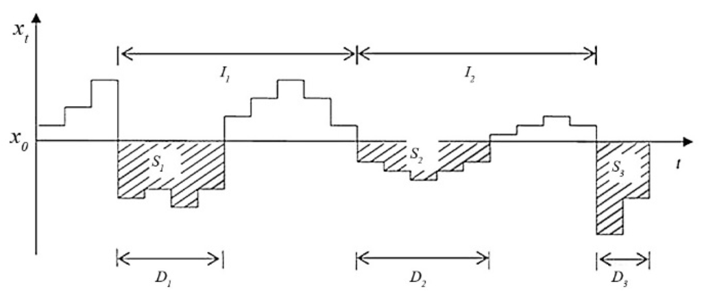 Drought characteristics using the run theory: D1, D2, … denote drought duration; S1, S2, … denote drought severity; I1, I2, … denote drought arrival time.