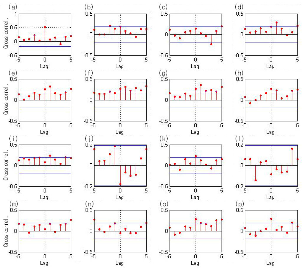 Cross correlation diagram between streamflow and tree ring data at: (a) Felkner Ridge; (b) Lemon Canyon; (c) Calamity Creek; (d) Dalton Reservoir; (e) Hager Basin Reservoir; (f) Antelope Lake (Pinis Jeffreyi Balf.); (g) Antelope Lake (Pinus Ponderosa Douglas ex C. Lawson); (h) Steens Mountain; (i) Hell’s Half Acre; (j) Donner Summit; (k) Frederick Butte; (l) Spring Canyon; (m) St. White Mountain; (n) Devil’s Dance Floor; (o) Sorrel Peak; and (p) Piute Mountain.