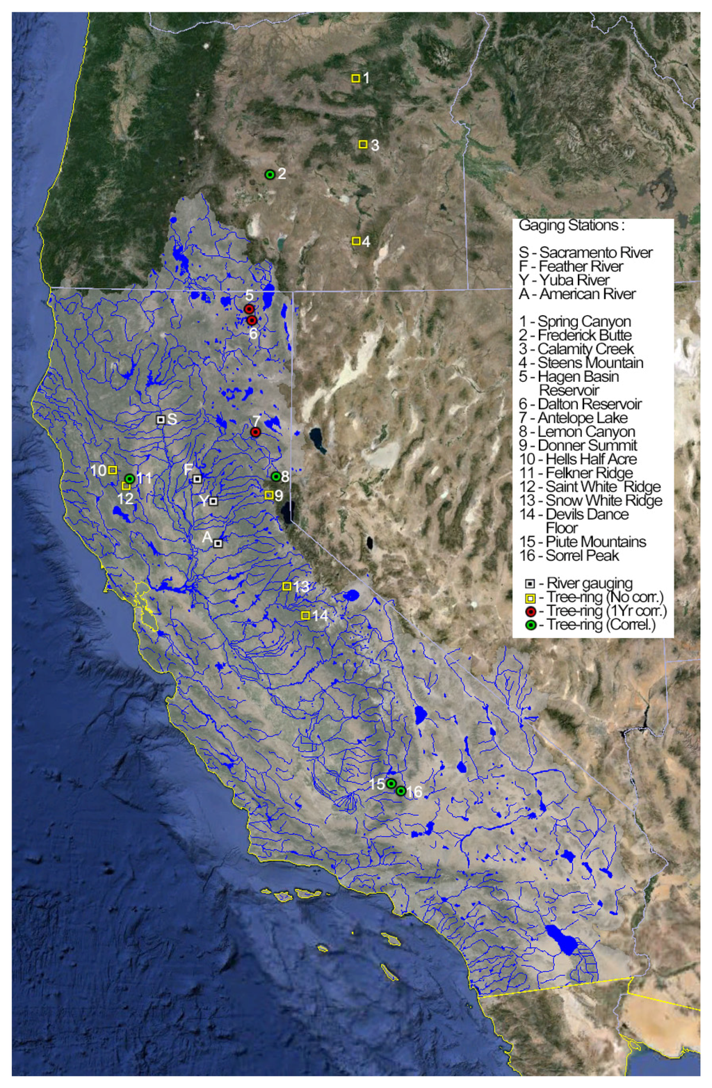 Annual streamflow data for four Sacramento rivers and tree-ring data of the nearby region were employed in this study. The tree-ring data from 17 sites (Figure 1 and Table 1) in California and Oregon, which reflect standard chronologies of ring width [], were obtained from the International Tree-Ring Databank []. The tree ring width data were standardized []. Annual streamflow is the sum of four river flows, which are the Sacramento River above Bend Bridge (SBB), the Feather River at the Lake Oroville (FTO), the Yuba River near Smartville (YRS) and the American River at Folsom (AMF), which was obtained from the California Data Exchange Center of California Department of Water Resources [] for the period 1872 to 1977. It has a long-term mean of 18.9 MAF (million acre-feet; 1.23 × 109 m3), median of 17.6 MAF, and maximum flow of 51.6 MAF that occurred in the year 1890. These tree ring and streamflow sites are shown in Figure 1 and Table 1.