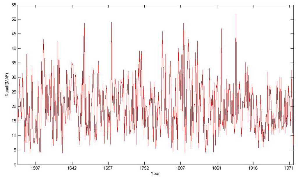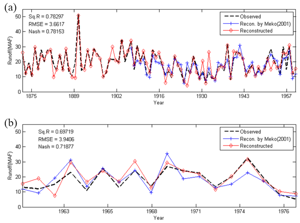 The reconstructed streamflow using the selected predictor (nine tree rings) is shown in Figure 7 and the basic statistics are shown in Table 3, with an average of 18.9 MAF observed and 20.4 MAF of reconstructed streamflow.